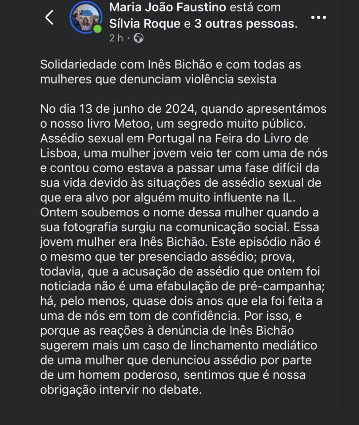 Apesar de a publicação da advogada de 30 anos ter sido rapidamente apagada, surgem agora notícias que estas alegações eram conhecidas no seio do partido já há dois anos, avançou o "Observador". Também nas redes sociais, as autoras do livro "#Me Too - Um Segredo Muito Público - Assédio sexual em Portugal" publicaram uma carta aberta às mulheres que denunciam situações de violência sexista, e relataram um episódio de 2024 com Inês Bichão.
