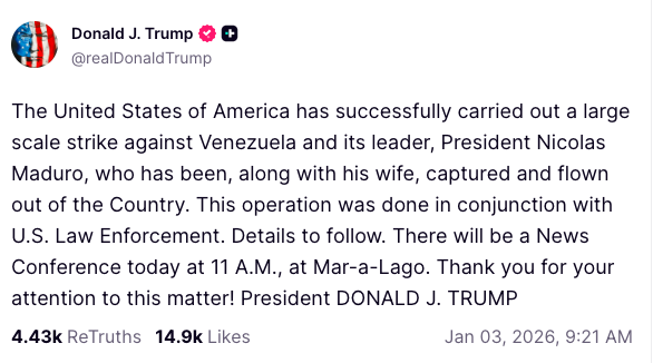 Entretanto, Donald Trump afirmou, através de uma publicação na rede social Truth Social, que Nicolás Maduro e a mulher terão sido capturados e levados para fora da Venezuela, descrevendo a ofensiva como “um ataque em larga escala contra a Venezuela e o seu líder”. O presidente norte-americano acrescentou ainda que a operação foi realizada em conjunto com forças de segurança dos Estados Unidos.