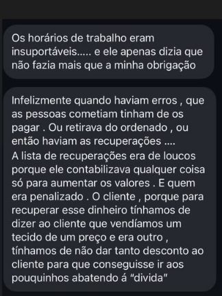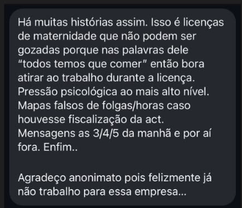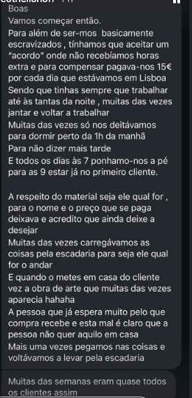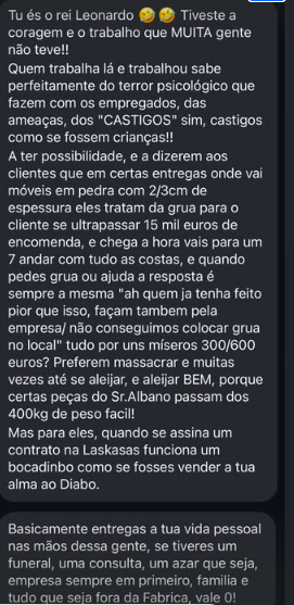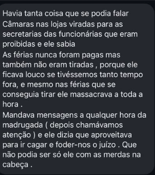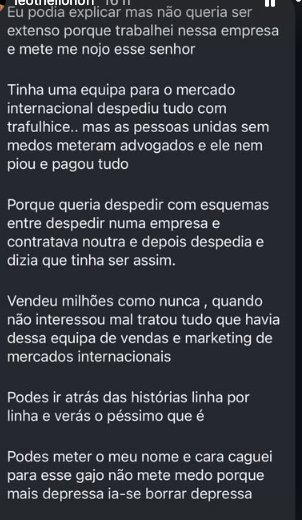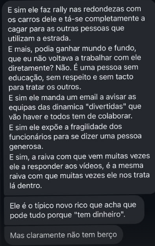 "Ele manda mensagens [aos funcionários ] às duas da manhã, se não responderes estás f*dido. Trata os trabalhadores mal, diz que são 'uns merdas'", detalha, dizendo ter sido contactado por quem esteve "das cinco da manhã até às 22 horas a alancar".