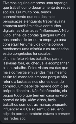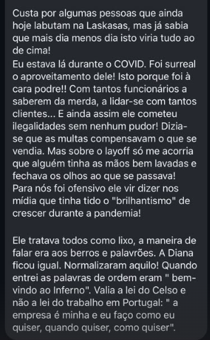As acusações foram expostas no Instagram por outro empresário, Leonardo Travassos (@leothelionoff), que assegura que estas denúncias — publicadas nas stories, sem que se possam confirmar a total veracidade das mesmas — partem de pessoas que alegadamente trabalharam ou trabalham na empresa de Celso Lascasas. A MAGG falou com Leonardo Travassos, que fala em "nojo", "humilhações", "trabalho a mais", "coisas obscenas" e garante: Celso Lascasas "é um monstro".