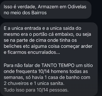 "Eles vão dormir num armazém em Odivelas cheio de baratas. Eram dez homens, existiam dois chuveiros e uma sanita", descreve, com base em relatos de alegados funcionários. "Os empregados e os ex empregados dele estão a contactar-me. Há coisas que não posso dizer", continua, justificando a necessidade de proteger estas testemunhas.