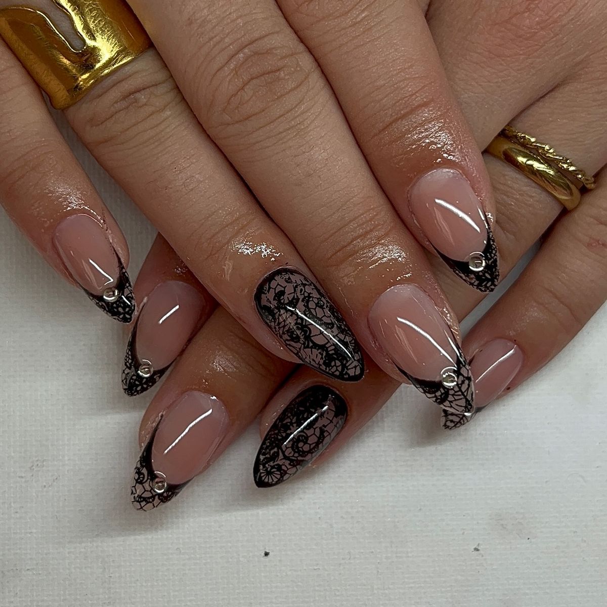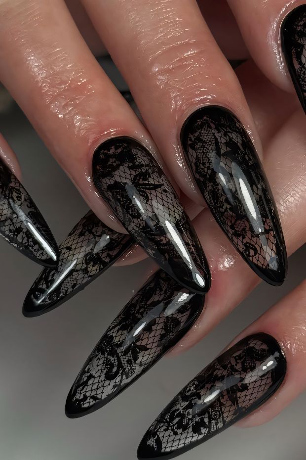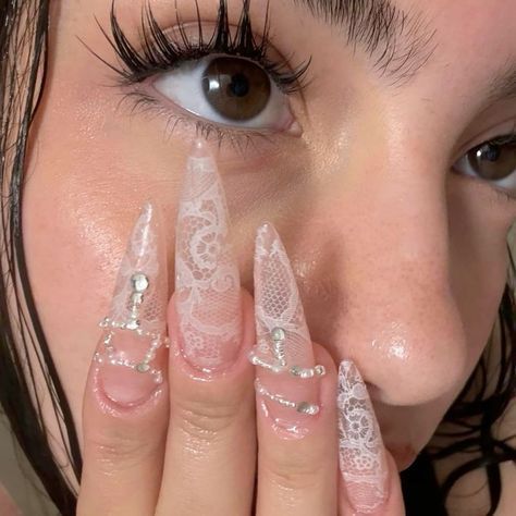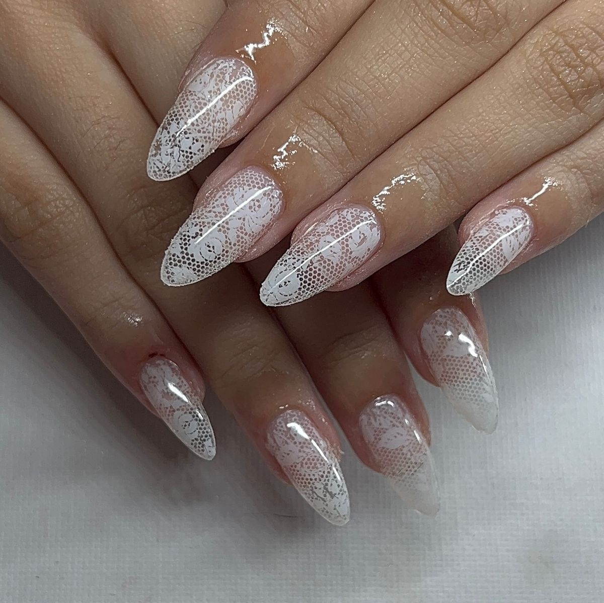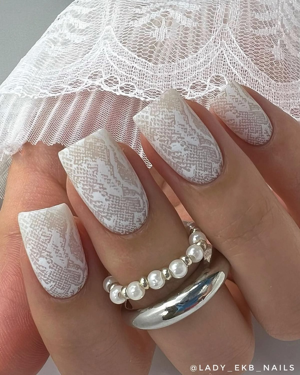 Se o tecido carrega séculos de erotismo, delicadeza e rebeldia, porque não traduzi-lo para as pontas dos dedos? Assim consegue unhas que parecem saídas de um baú vintage, mas com acabamento super contemporâneo. Há versões em preto para quem quer drama, brancos nupciais para noivas que recusam clichés, e a lista continua.