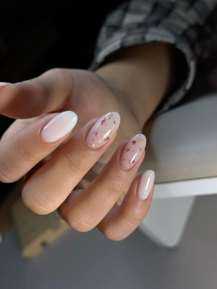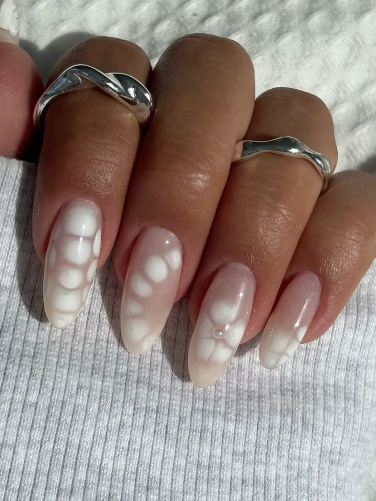 Outra forma de dar nova vida ao leitoso é através de aplicações delicadas, como flores, pequenos pontos (olá, polka dots), rendilhados minimalistas ou micro-apontamentos em tons pastel, que transformam a base neutra numa tela elegante e sofisticada. Estes detalhes funcionam quase como uma espécie de joalharia para as unhas, acrescentando dimensão sem comprometer a sobriedade da manicure.