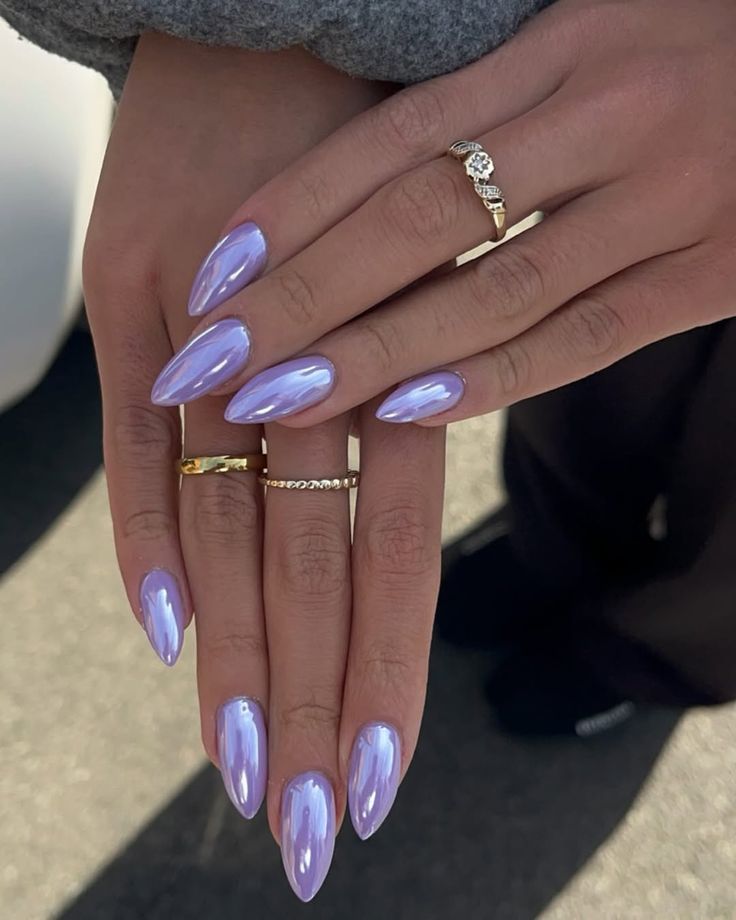 Outra forma de usar esta tendência é através de acabamentos distintos. O efeito gel oferece brilho e durabilidade, enquanto os acabamentos mate dão um toque contemporâneo e menos previsível. Para quem gosta de variar, vale a pena alternar entre um lilás pastel e um tom mais fechado ao longo da estação.