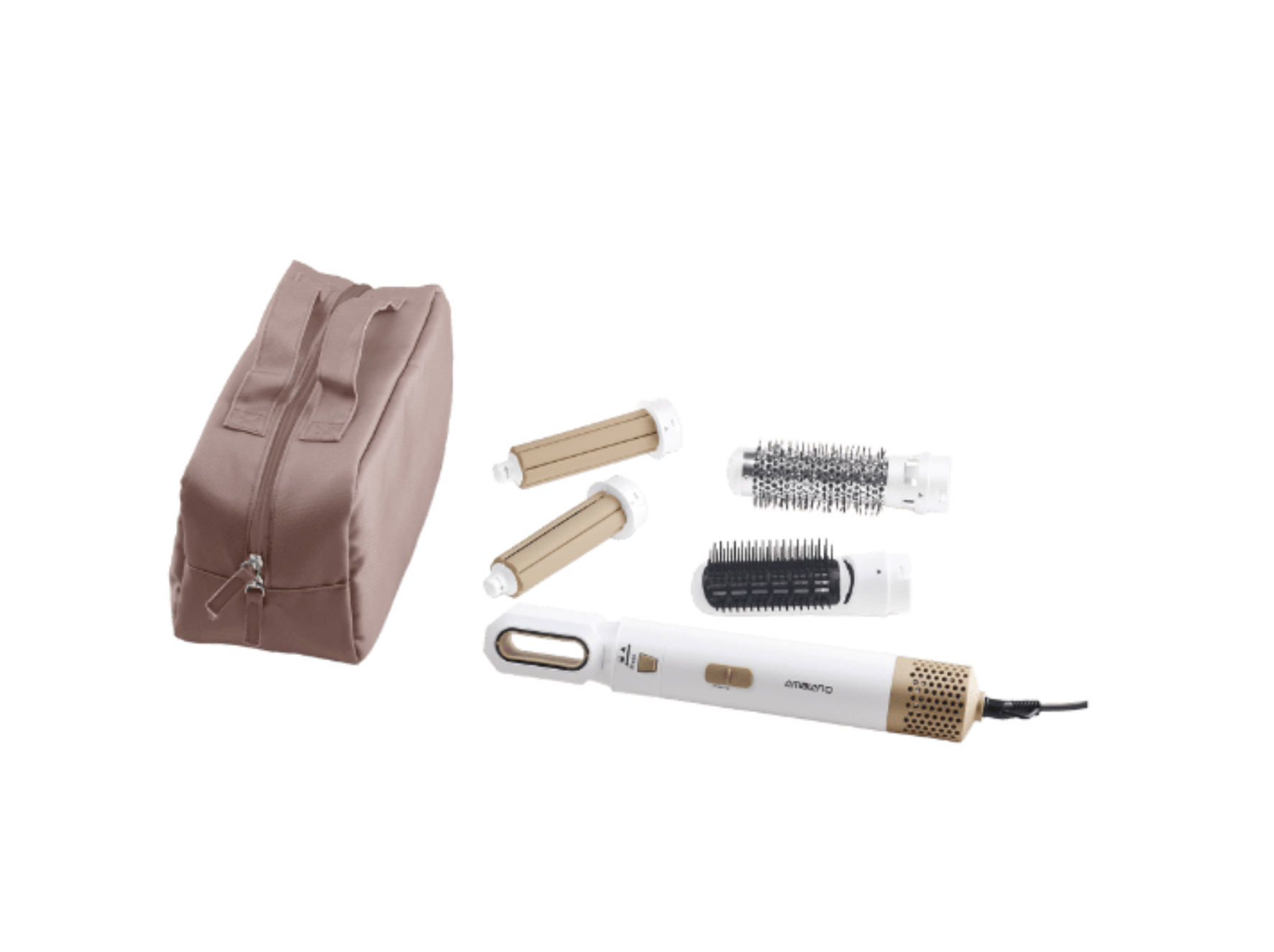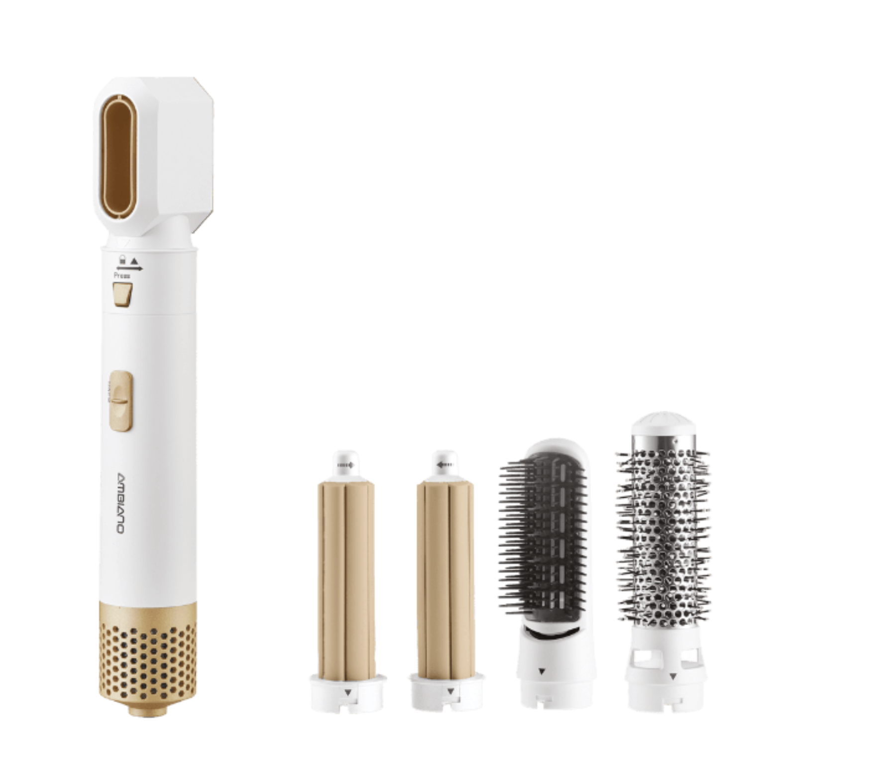 O gadget tem uma potência entre 800 e 1000 watts, três níveis de temperatura, cabo rotativo de 360º e uma prática bolsa de transporte. Nas cabeças incluídas, há escova ventilada para volume, escova de alisamento para um look polido, concentrador para secagem rápida e ferros de encaracolar para madeixas perfeitas.