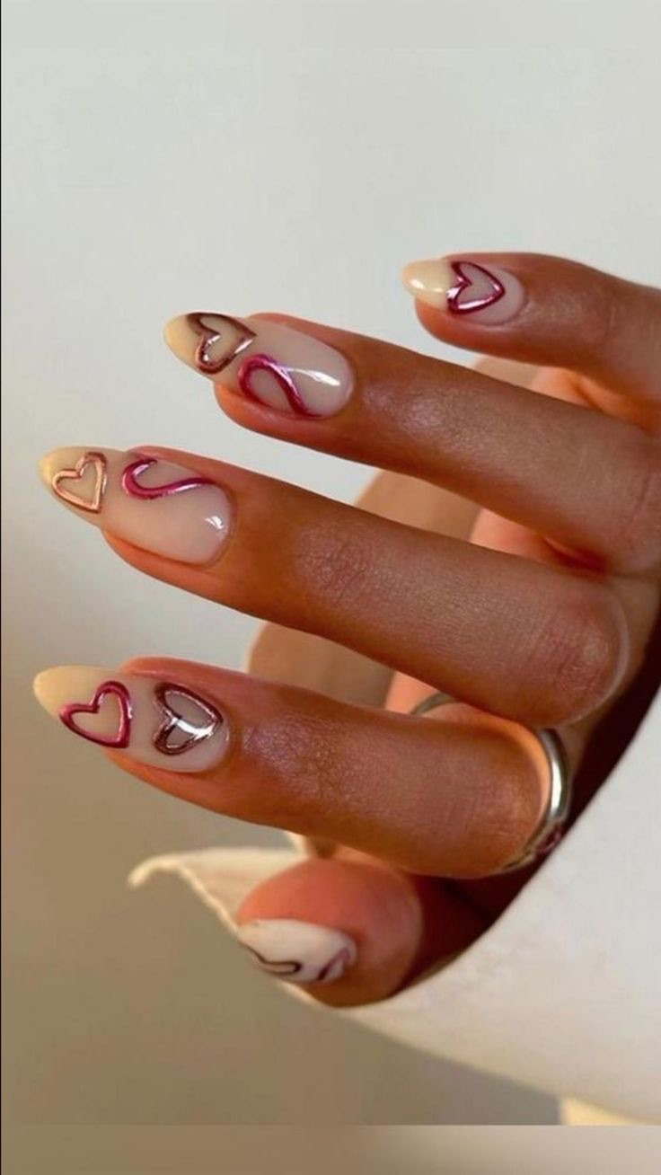 Os clássicos corações mantêm-se como um elemento incontornável, mas aparecem reinventados, sendo integrados em nail arts gráficas ou subtilmente recortados nas pontas das unhas, numa versão mais fora da caixa da tradicional manicure francesa. São opções românticas, sim, mas com um lado artístico e contemporâneo que conquista até quem costuma fugir deste tipo de cerimónias.