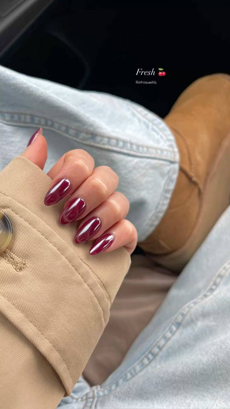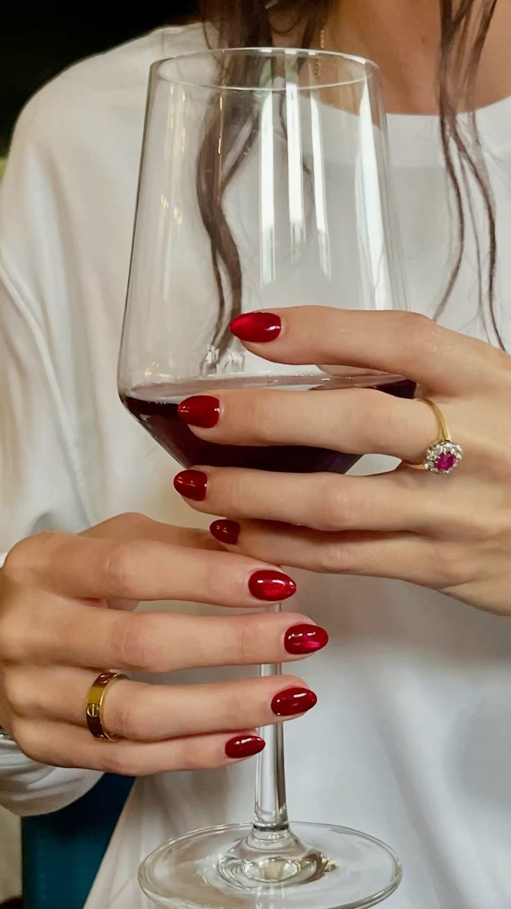 Uma das formas mais interessantes de atualizar as unhas vermelhas passa por brincar com os acabamentos. O vermelho ultra brilhante continua a ser um clássico, mas pode dar um passo ainda mais à frente e apostar as fichas todas em acabamentos perolados ou glazed, popularizados por Hailey Bieber.