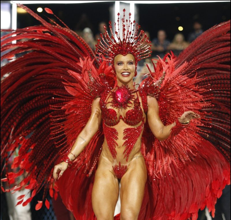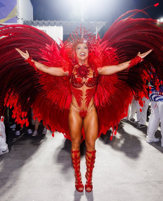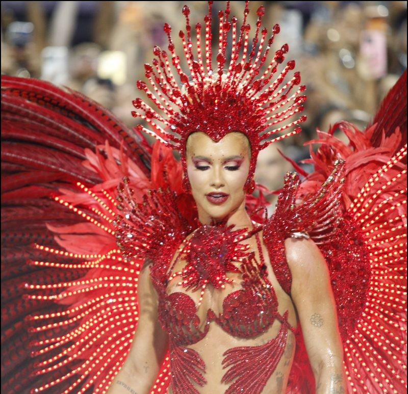 Para a ocasião, a influenciadora escolheu uma "fantasia" impressionante toda em vermelho, iluminada com várias luzes e com 60 mil cristais. O destaque do fato foram as costas, conhecido como "asas", que pesavam cerca de 12 quilos, tinham 3 metros de largura e 2,5 de altura.