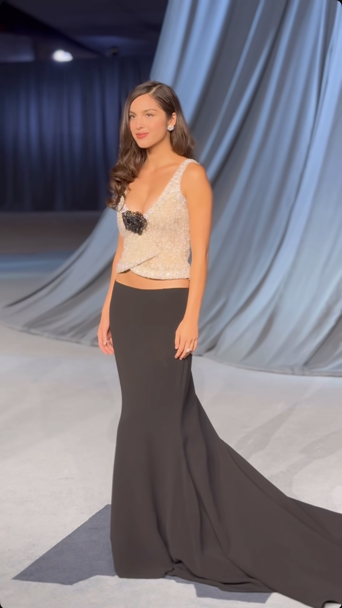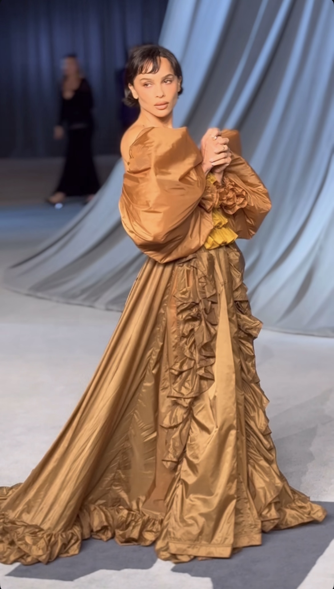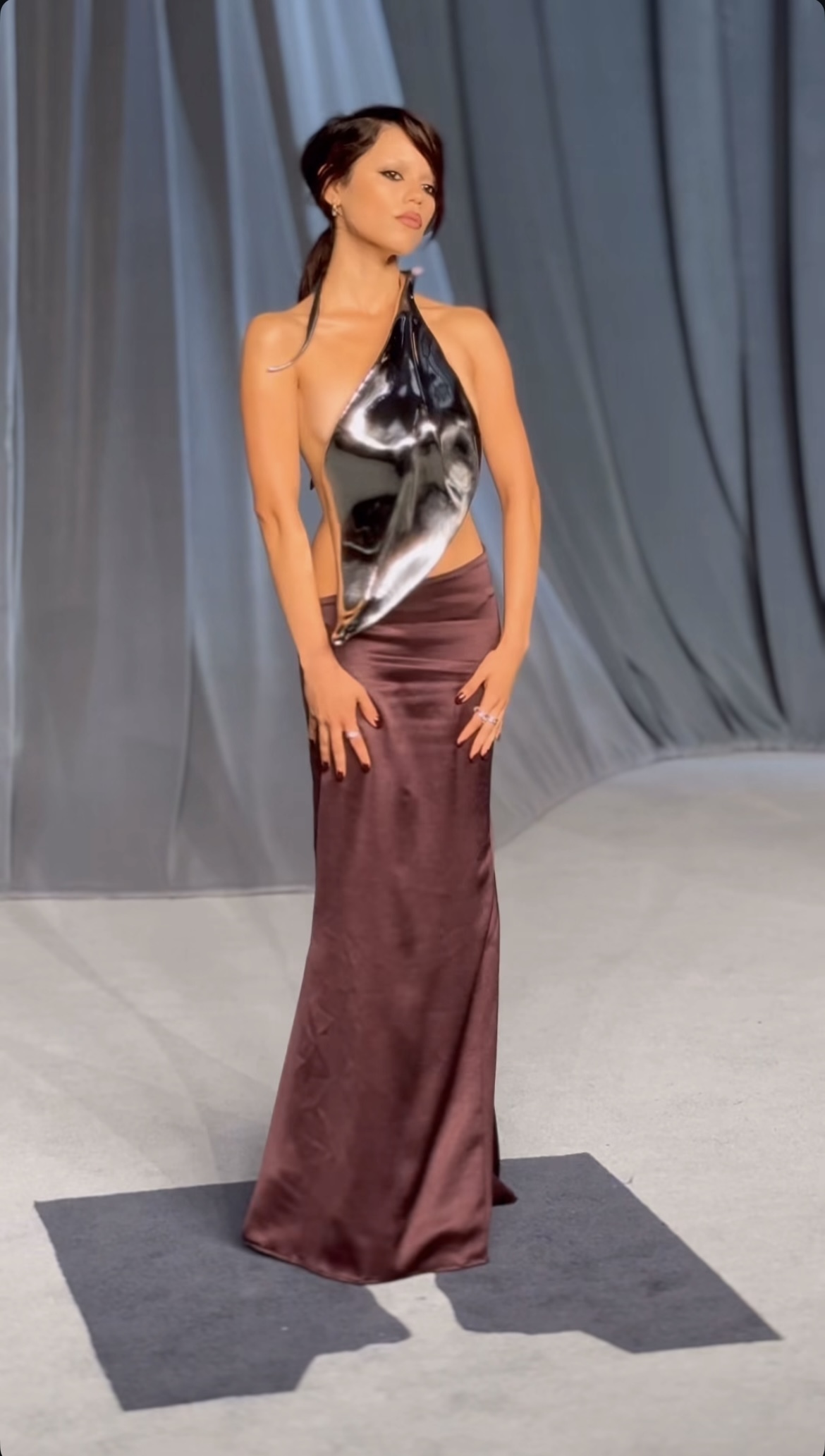 A filha de Kris Jenner surgiu à frente dos jornalistas com um vestido nude da Maison Margiela, todo ele justo ao corpo e que realçava a parte das costelas e do peito, para não falar da sua cintura. Nos braços, Kim Kardashian tinha duas longas peças do tecido do vestido e, na cabeça, a empresária contava com mais tecido ainda, que cobria desde o topo até ao pescoço. À mostra só tinha a parte do peito, que estava bem decorado com um grande colar cheio de diamantes.
