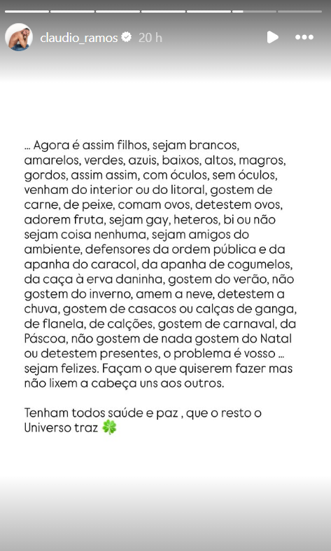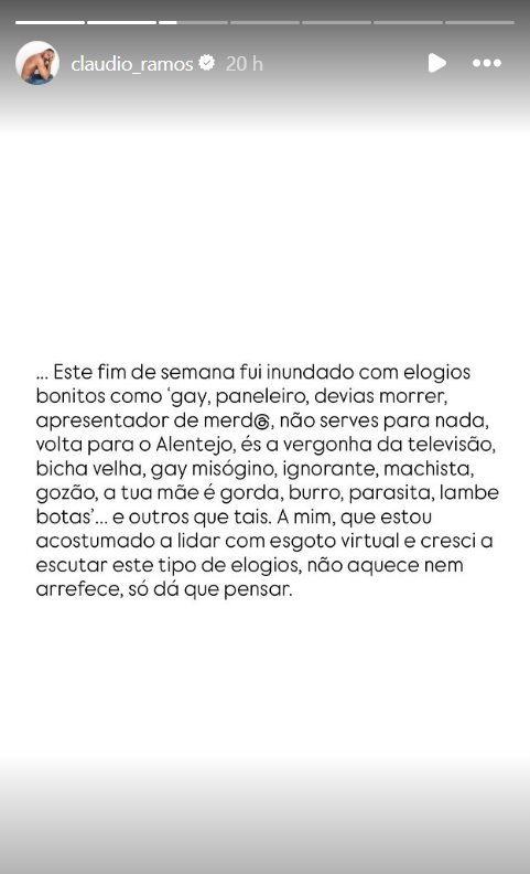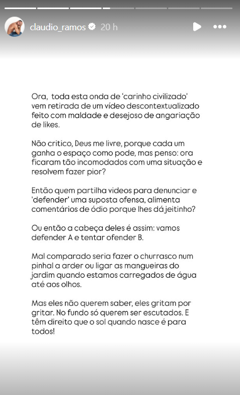 Além disso, Cláudio Ramos ainda perguntou se quem partilhou o vídeo para denunciar e defender é o mesmo que alimentou "comentários de ódio" porque lhe deu "jeitinho", acreditando que o que se "passa na cabeça deles", englobando mais pessoas que poderão pensar assim, é que para defender A é preciso ofender B. "Mas eles não querem saber, eles gritam por gritar. No fundo só querem ser escutados. E têm direito que o sol quando nasce é para todos!", escreveu ainda Cláudio Ramos.