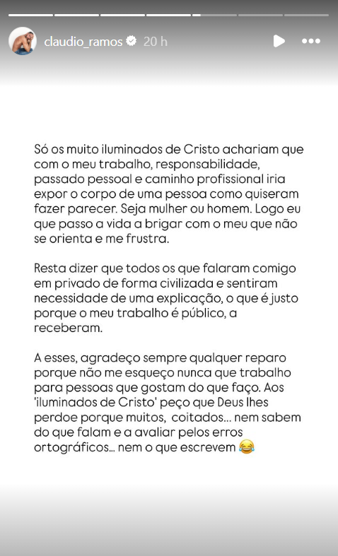 "Só os muito iluminados de Cristo achariam que com o meu trabalho, responsabilidade, passado pessoal e caminho profissional iria expor o corpo de uma pessoa como quiseram fazer parecer (...). Resta dizer que todos os que falaram comigo em privado de forma civilizada e sentiram a necessidade de uma explicação, a receberam. A esses, agradeço (...). Aos 'iluminados de Cristo', peço que Deus lhes perdoe, porque muitos, coitados, nem sabem do que falam, e a avaliar pelos erros ortográficos, nem o que escrevem", rematou o apresentador.