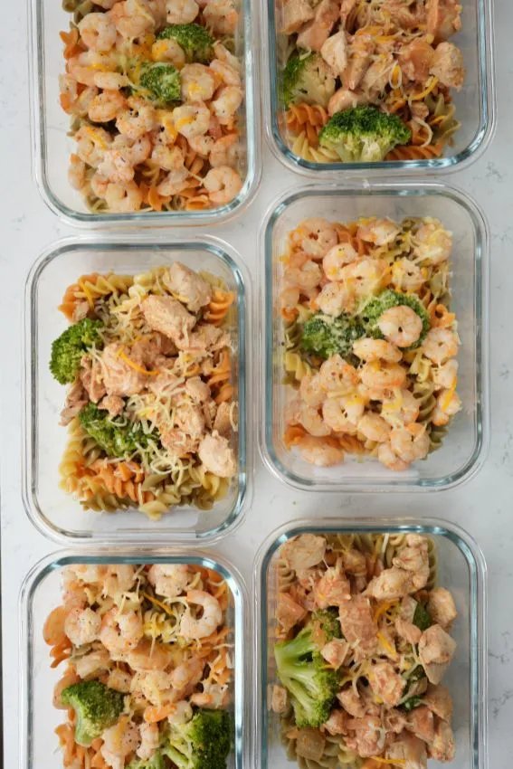 Comece por cozer a massa, com os brócolos e salteie o peito de frango, ou se preferir camarão, em azeite e alho. De seguida, coloque em caixas, e finalize com molho bechamel ou iogurte com duas colheres de polpa de tomate. Em cima coloque queijo ralado e leve à air fryer ou conserve no frigorifico ou congelador.