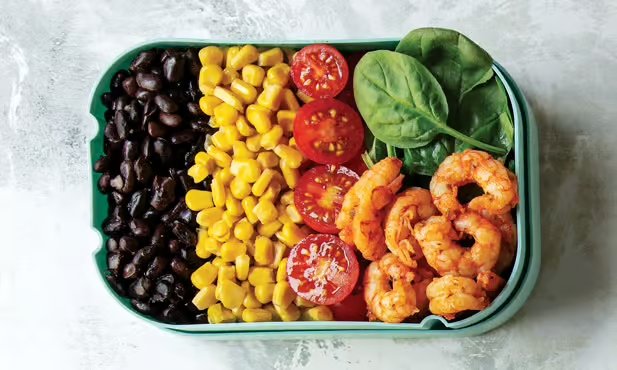 Comece por temperar o miolo da gamba com sal, paprica, sal, orégãos e azeite, misture bem. De seguida, aqueça uma colher de sopa de azeite na frigideira e salteie o gabão por quatro minutos. Retire e divida em duas lancheiras.Escorra o feijão preto e o milho e divida também pelas lancheiras. Depois, corte o tomate em metade e faça o mesmo processo. Adicione os espinafres, tempere e está pronto.