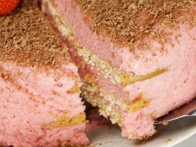 No fim, junte tudo, adicione as folhas de gelatina, derretidas, e envolva bem. Transfira para uma forma redonda forrada com película aderente e vá fazendo camadas com o preparado e recheio com bolachas. Leve ao frigorífico por 2 ou 3 horas até estar com a consistência certa. Por fim, está pronto a servir.