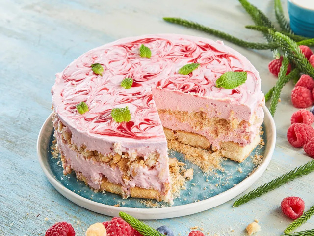 De seguida, bata as natas em chantilly e envolva com o preparado anterior. No fundo de uma forma coloque metade dos palitos partidos em pequenos pedaços. Cubra com metade do preparado já feito. Coloque os restantes palitos e cubra o resto com o creme. Termine, colocando o preparo de frutos vermelhos para decoração e leve ao congelador para ficar firme. Decore com frutos vermelhos e está pronto a servir.