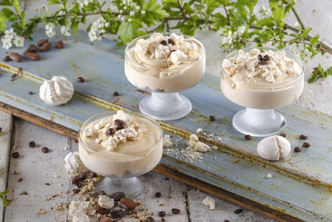 No fim, retire as taças do congelador, polvilhe com os suspiros, grosseiramente partidos, e adicione os grãos de café.