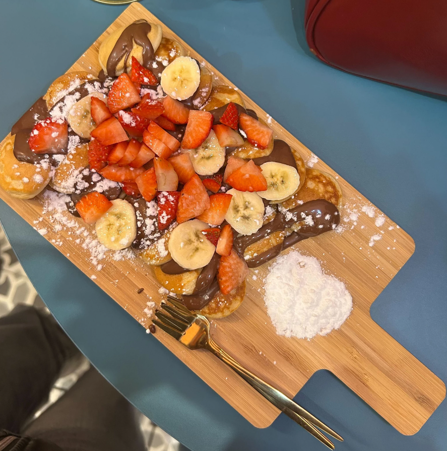 Há toppings para todos os gostos: Nutella, Kinder Bueno, Kitkat, doce de leite, mel, pistácio, manteiga de amendoim, chantilly, compota de frutos ou granola.