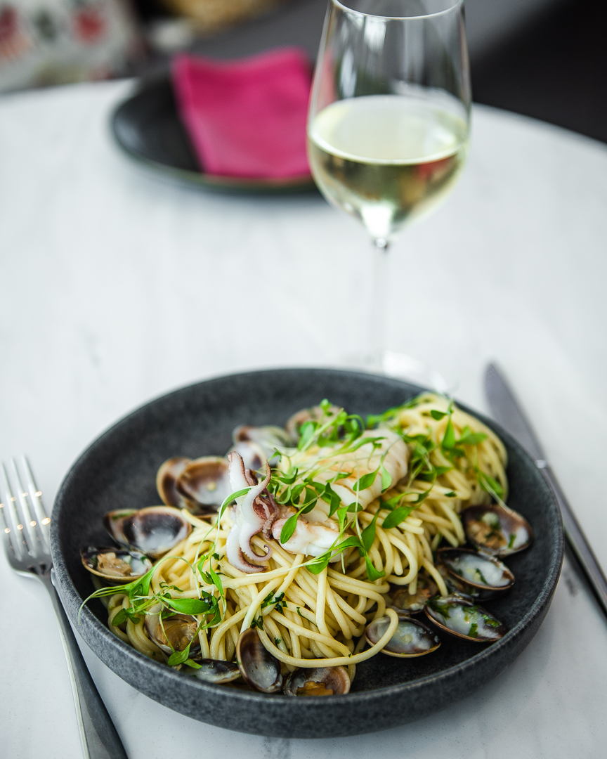 O VELA, o novo restaurante do Yotel Porto, propõe spaghetti à Bulhão Pato, finalizado com lula grelhada e coentros frescos (16€).