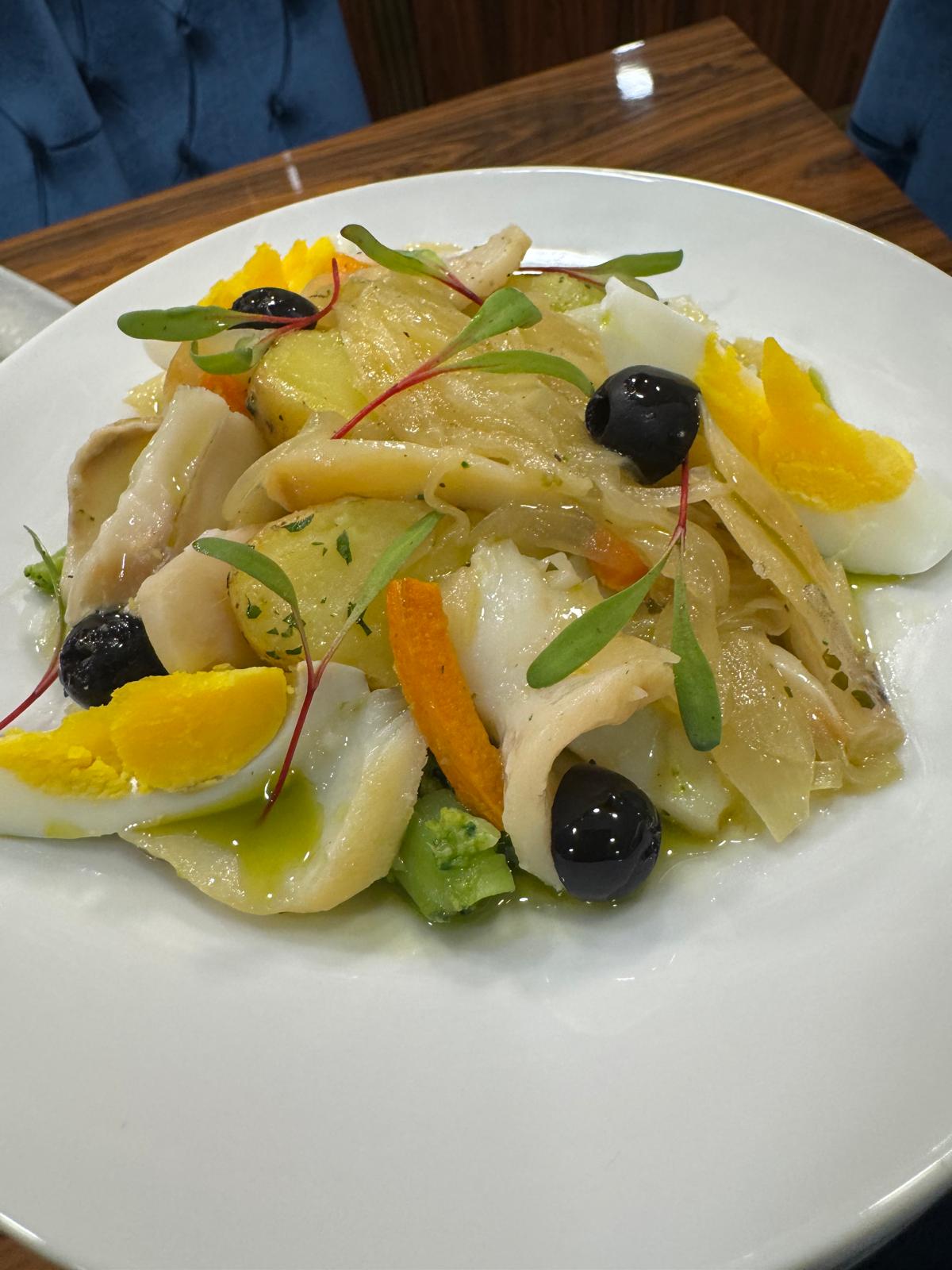Bacalhau desconstruído com batata jovem, legumes salteados e ovo cozido