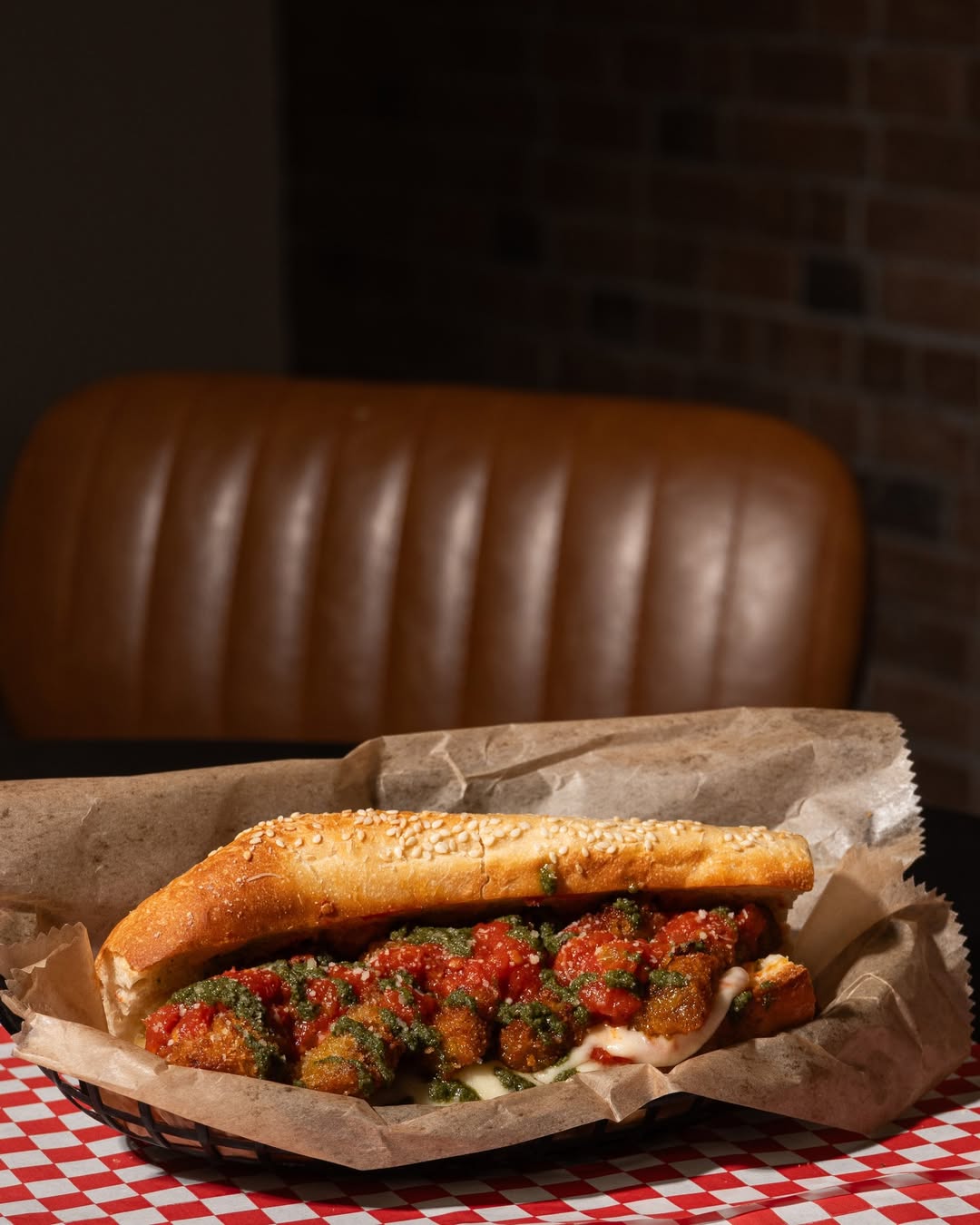 Pode ainda optar pela meatball parm, com almôndegas, mozzarella e molho marinara (10,50€), ou pela eggplant parm, com beringela, mozzarella e molho marinara (10,50€). O pão é caseiro e cozido diariamente. Existem molhos como queijo azul (2€), maionese picante (1,50€) e alioli de alho assado (1,50€).