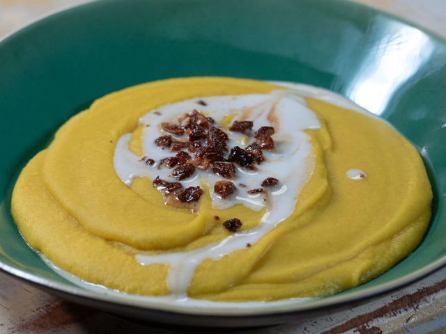 Tape e deixe apurar por 10 minutos. Seguidamente, numa frigideira pré-aquecida com o óleo de coco, salteie o caju picado e acrescente o mel, a canela e sal. Envolva até ficar crocante e reserve. Acrescente ao tacho as lentilhas vermelhas e junte a água a ferver e deixe cozinhar entre 15 a 20 minutos. Por fim, triture a sopa e acompanhe com o creme de coco e o caju.
