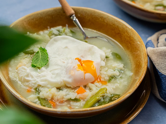 Coe o caldo para este tacho e junte os lombinhos de bacalhau e deixe escalfar por cinco minutos. Depois, retire os lombinhos e adicione a segunda cenoura em cubos, o arroz carolino e deixe cozer durante 12 minutos. Ao fim deste tempo, juntar o feijão verde cortado e o bacalhau lascado. No momento de servir, coloque um ovo escalfado por cima de cada prato e decore com hortelã.