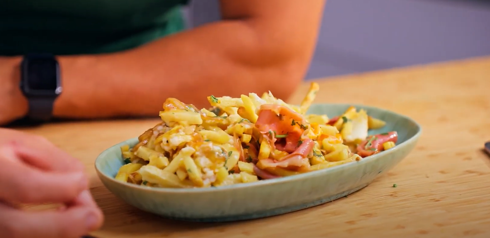 Descasque as batatas, corte em palitos e coloque-as na air fryer. Tempere com sal e regue com azeite. Deixe cozinhar por 15 minutos a 200ºC. Corte uma cebola em meia-lua e caramelize numa frigideira quente, com um pouco de azeite, sal e pimenta. Quando as batatas estiverem crocantes, parta cinco ovos e coloque-os em cima das mesmas. Tempere com sal e pimenta, e coloque mais 4 minutos na air fryer para os ovos cozinharem. Com as claras já cozinhadas e as gemas molinhas, adicione uma embalagem de presunto fatiado. Junte a salsa picada e a cebola caramelizada por cima. Para dar um toque especial, regue com um fio de maionese de sriracha (pode substituir por maionese simples).