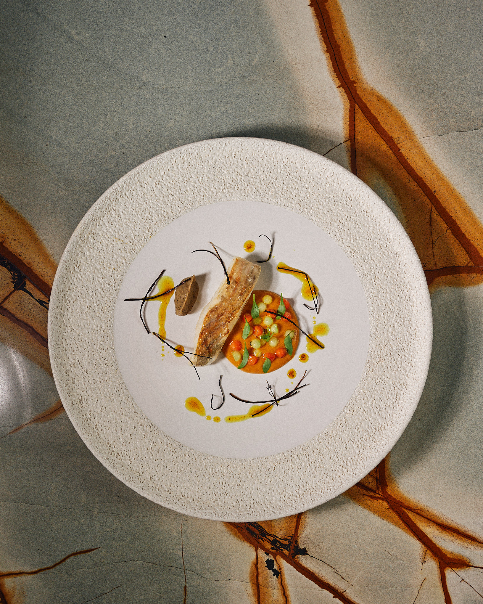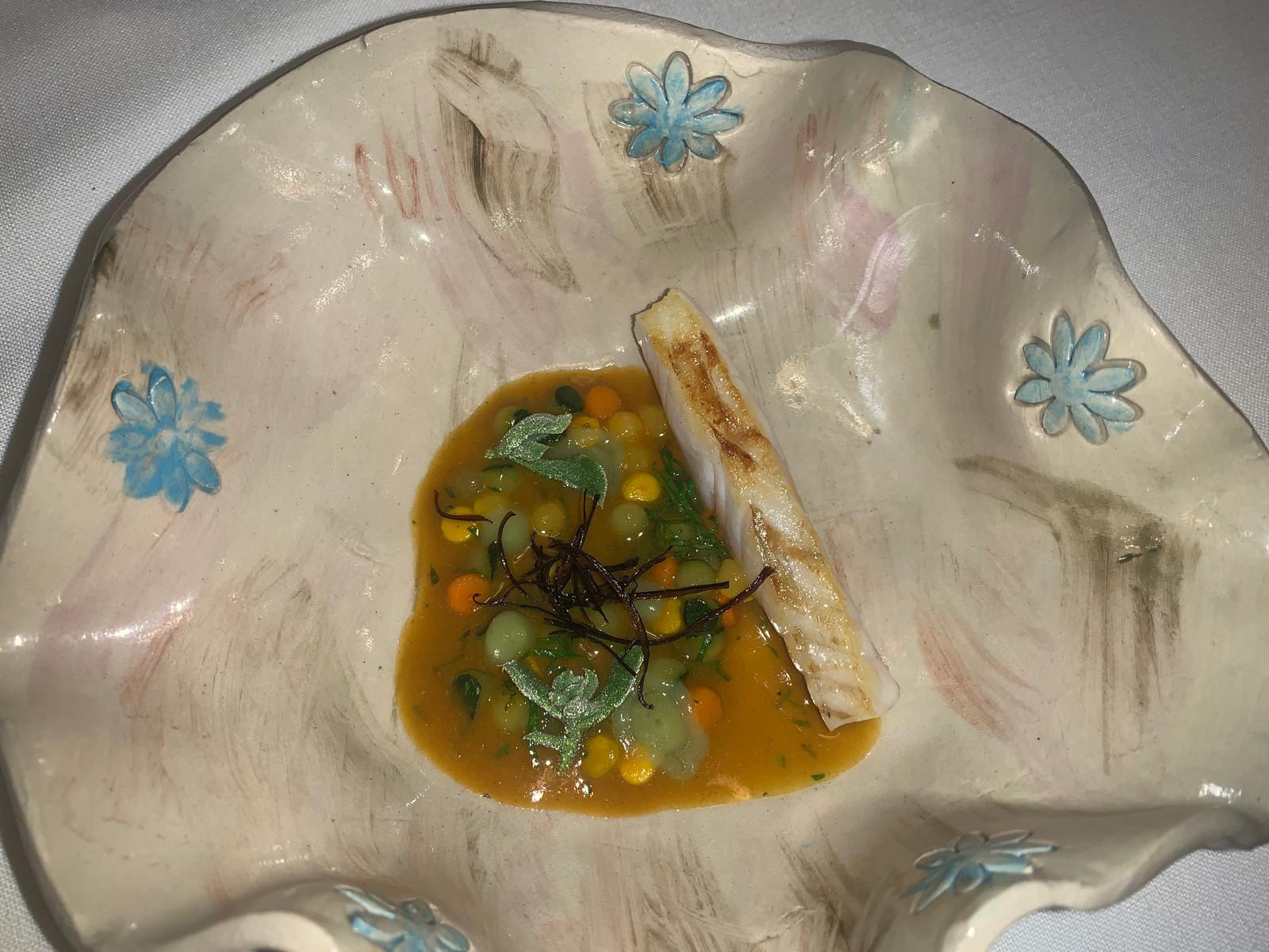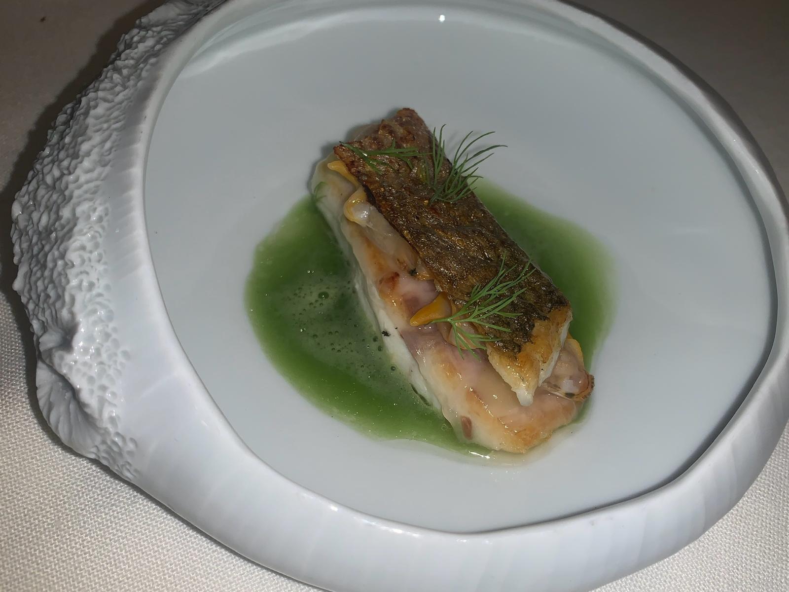 Foi nele — quente — que barrámos o creme de castanha e enchidos e a manteiga de cabra, que evapora na boca (e é ótima). O cítrico Lobo de Vasconcelos 2022 viria anteceder a fase Demora, que traria "um bocadinho mais de Cascais", como apresentou o chef, abrindo caminho para a dourada da Linha.
