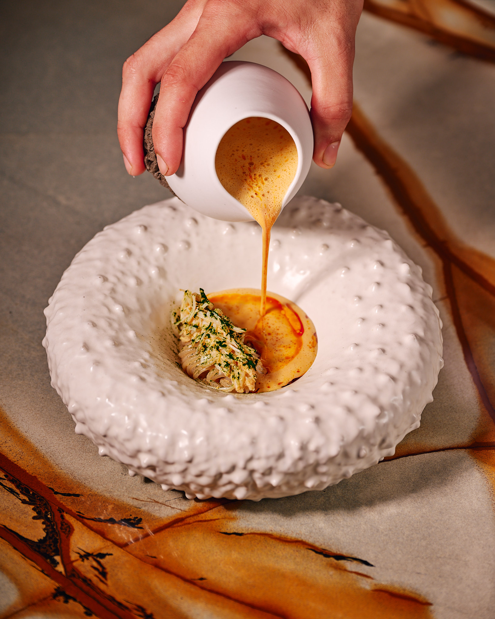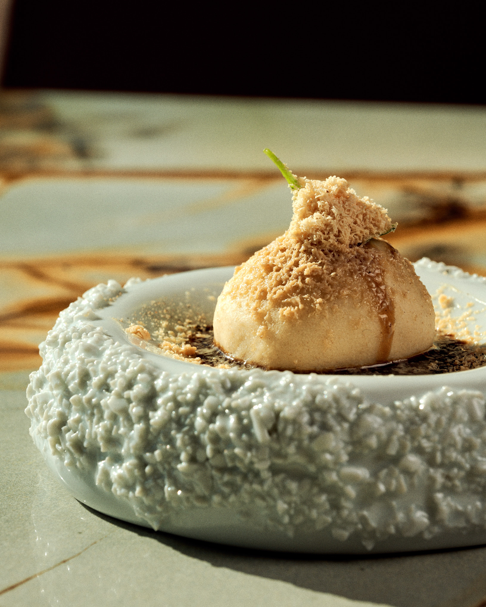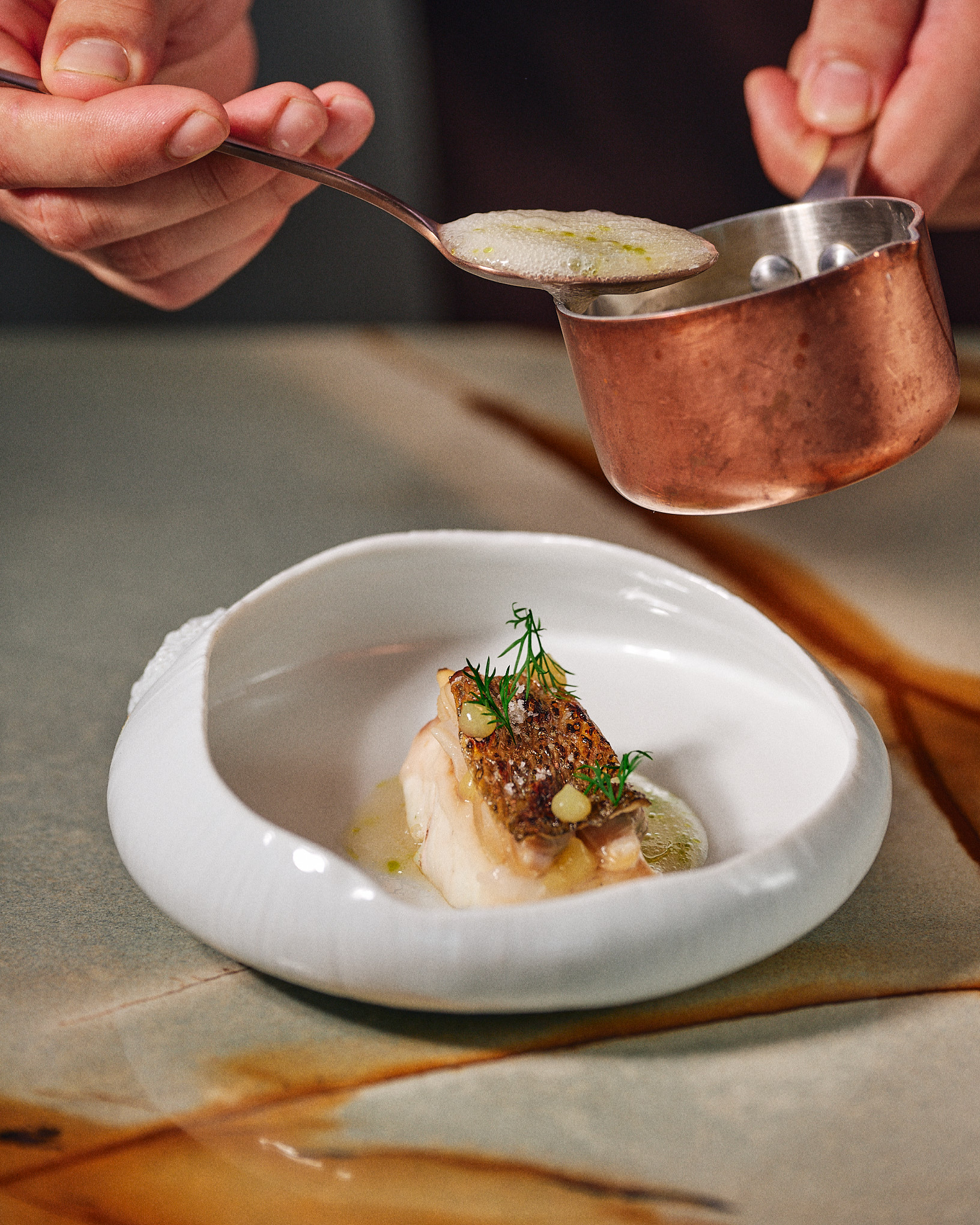 Foi nele — quente — que barrámos o creme de castanha e enchidos e a manteiga de cabra, que evapora na boca (e é ótima). O cítrico Lobo de Vasconcelos 2022 viria anteceder a fase Demora, que traria "um bocadinho mais de Cascais", como apresentou o chef, abrindo caminho para a dourada da Linha.