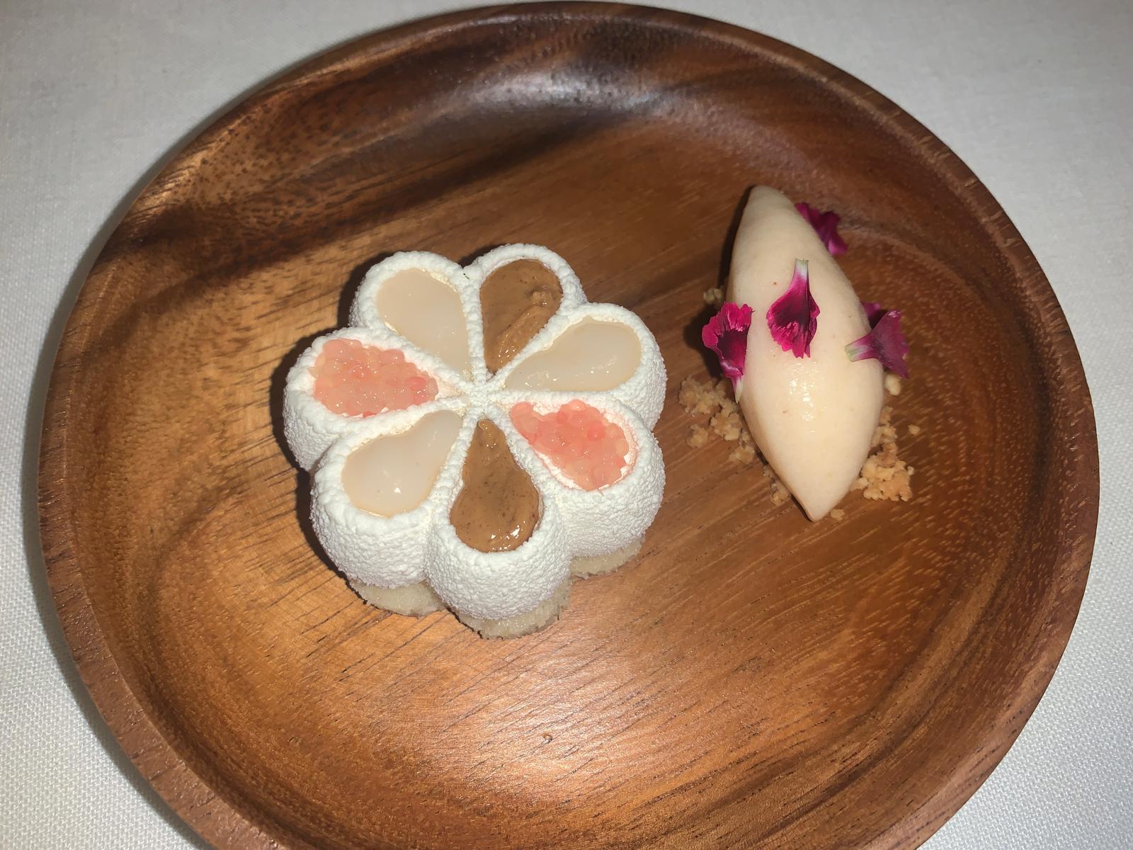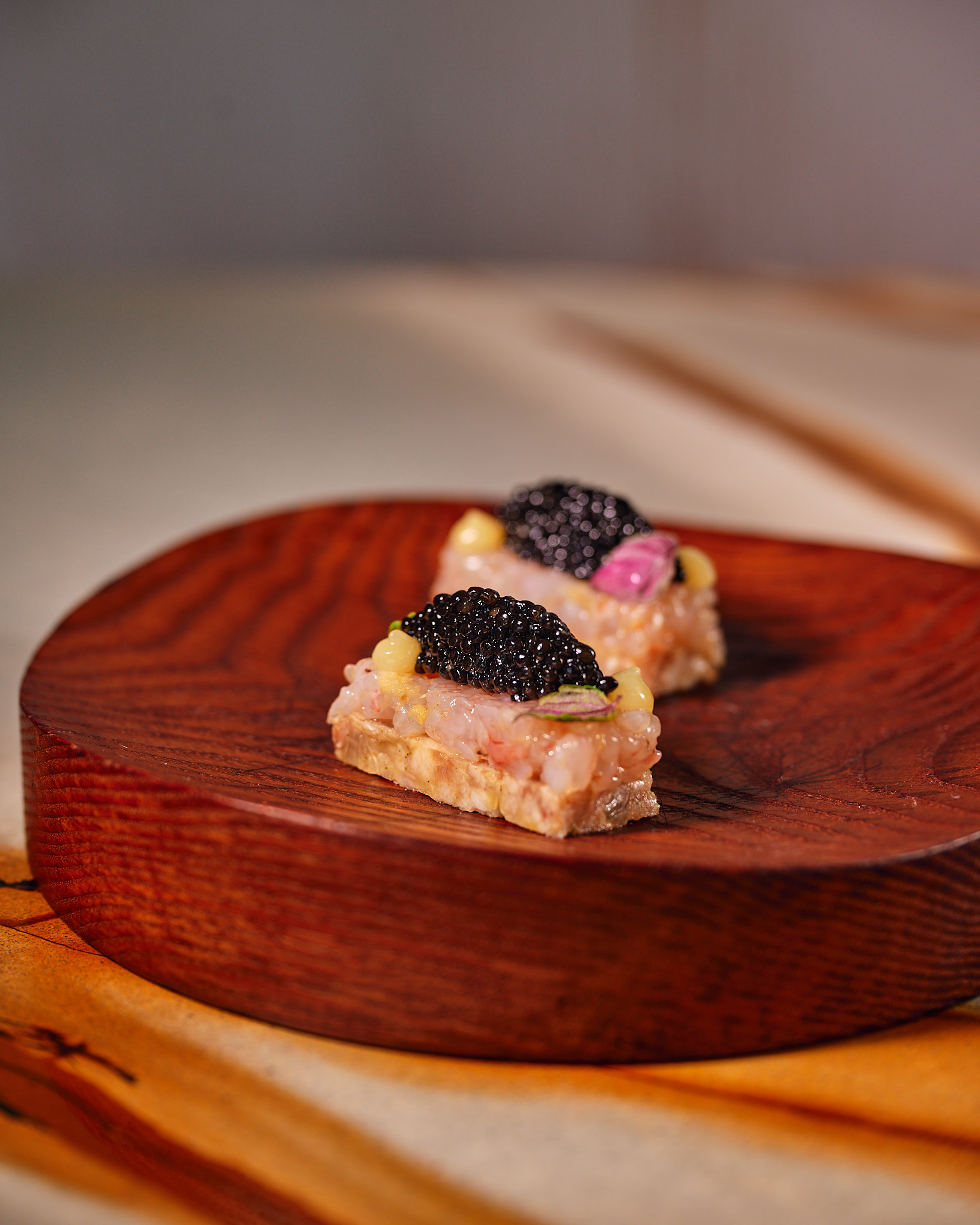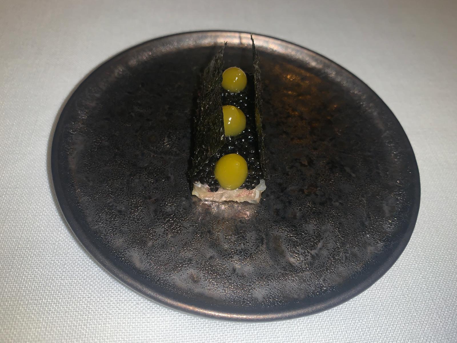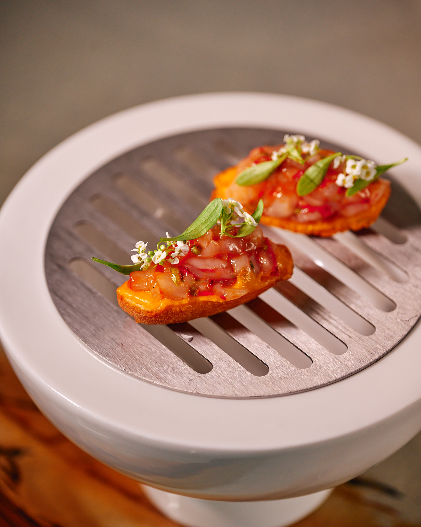 Até aqui, emparelhámos com o alentejano, cremoso e doce, Monte das Herdades 2020. Seguir-se-ia a Passagem, a primeira memória: uma cabeça de xara com tártaro de gamba do Algarve, alga e maracujá (que, num primeiro momento, pensámos serem ervilhas). Desde a frescura do peixe à crocância da alga, acertou em tudo.