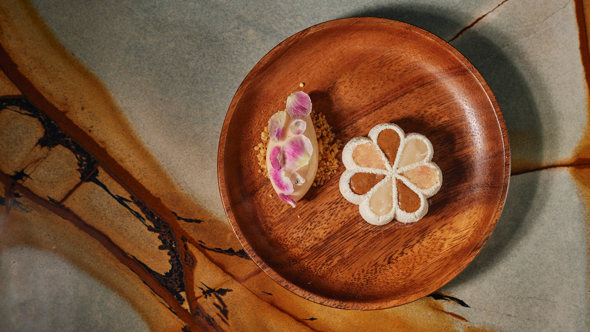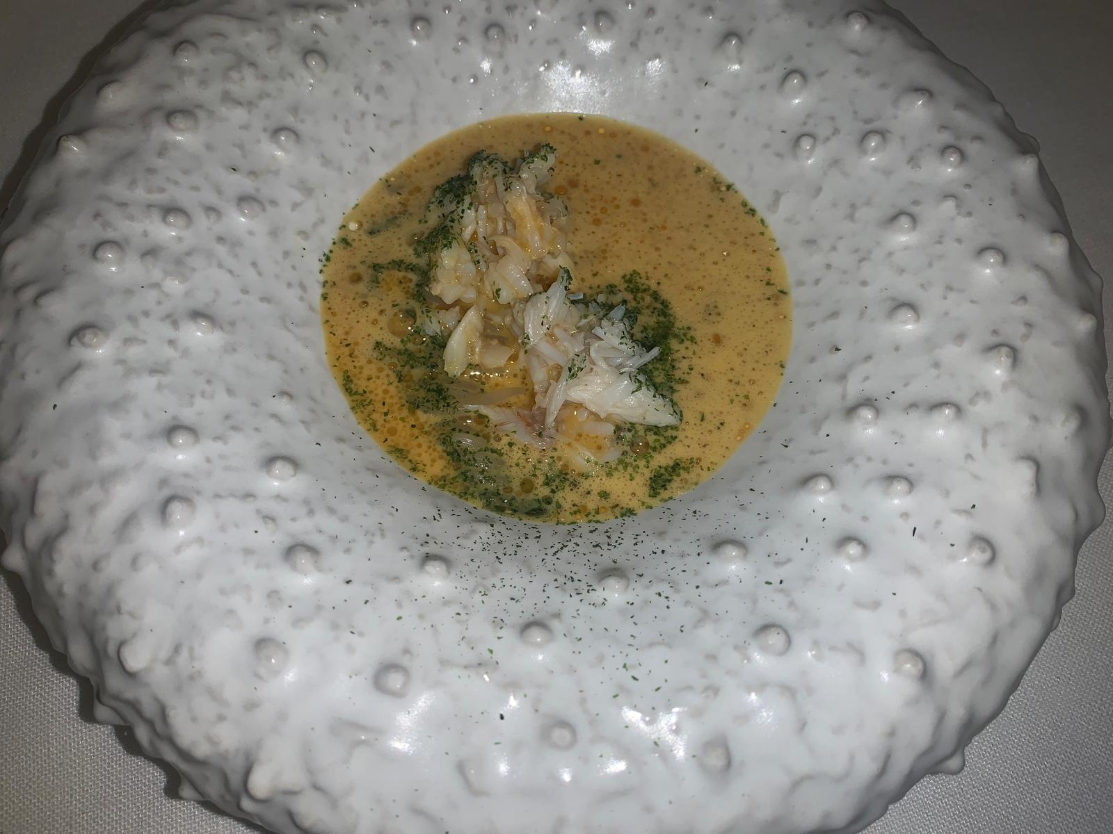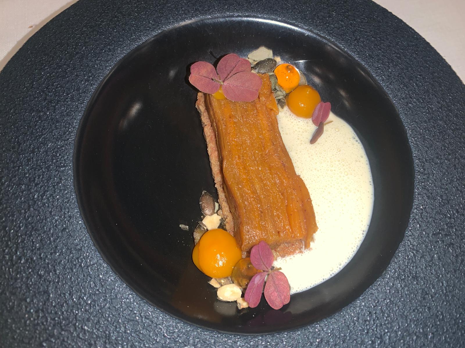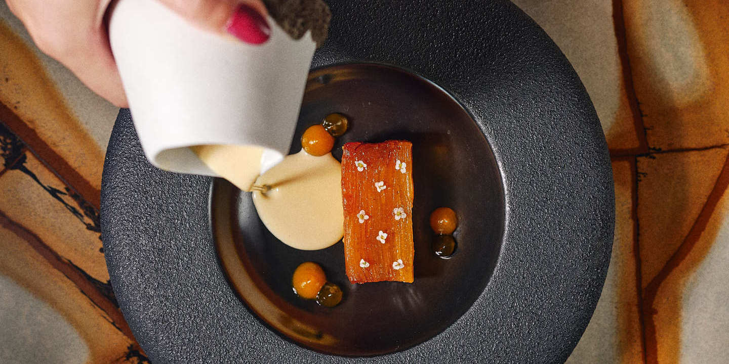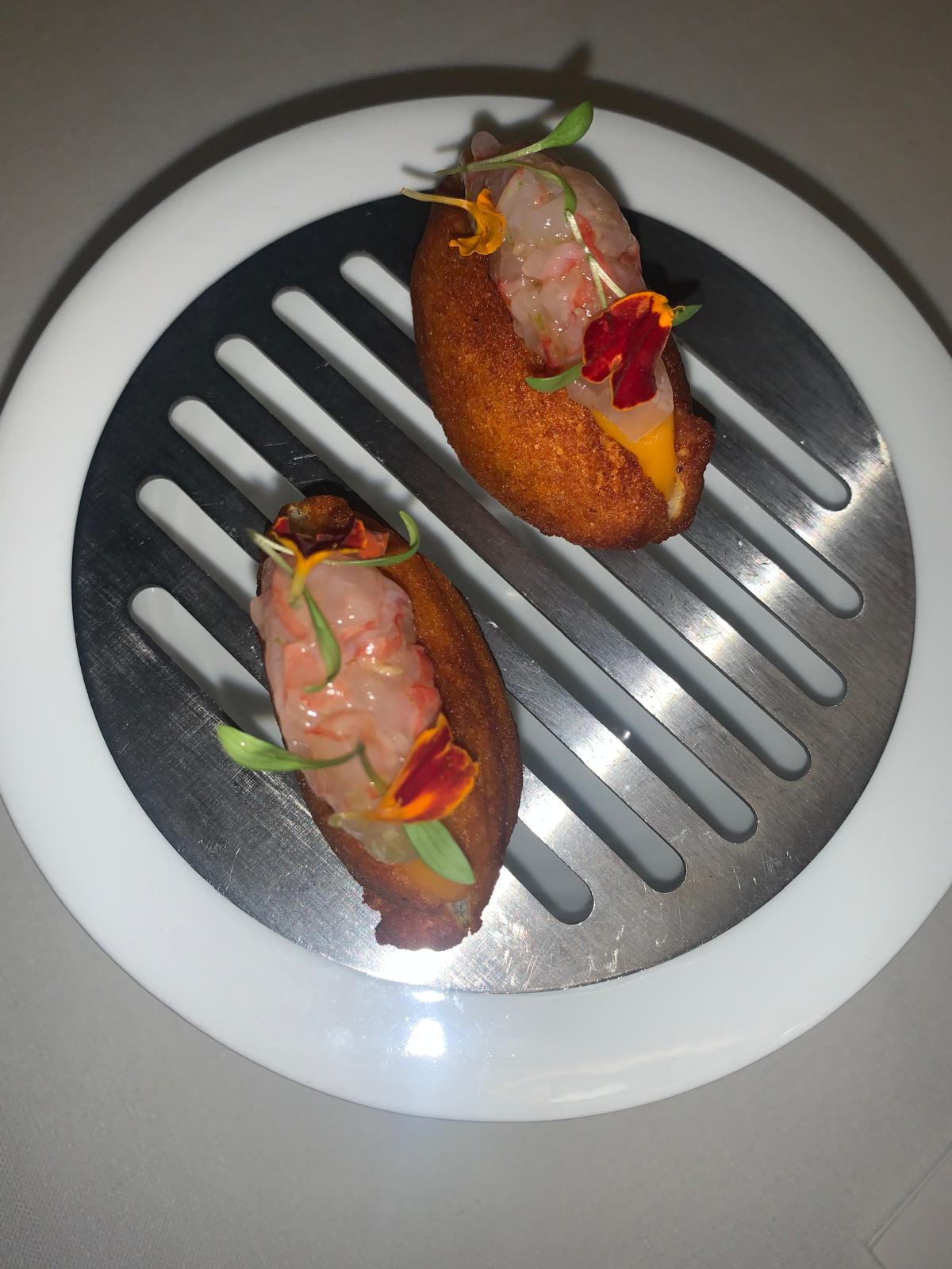 Até aqui, emparelhámos com o alentejano, cremoso e doce, Monte das Herdades 2020. Seguir-se-ia a Passagem, a primeira memória: uma cabeça de xara com tártaro de gamba do Algarve, alga e maracujá (que, num primeiro momento, pensámos serem ervilhas). Desde a frescura do peixe à crocância da alga, acertou em tudo.