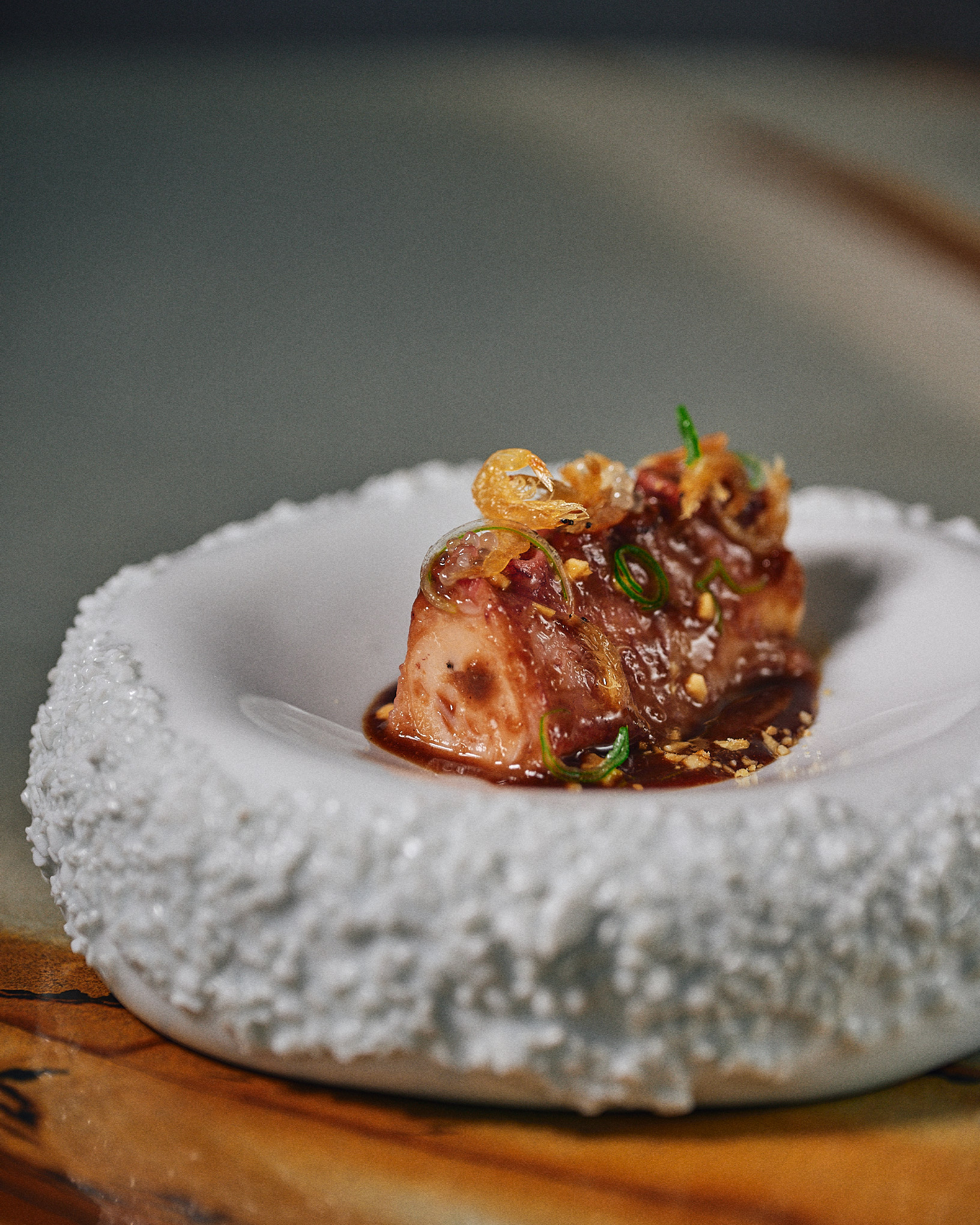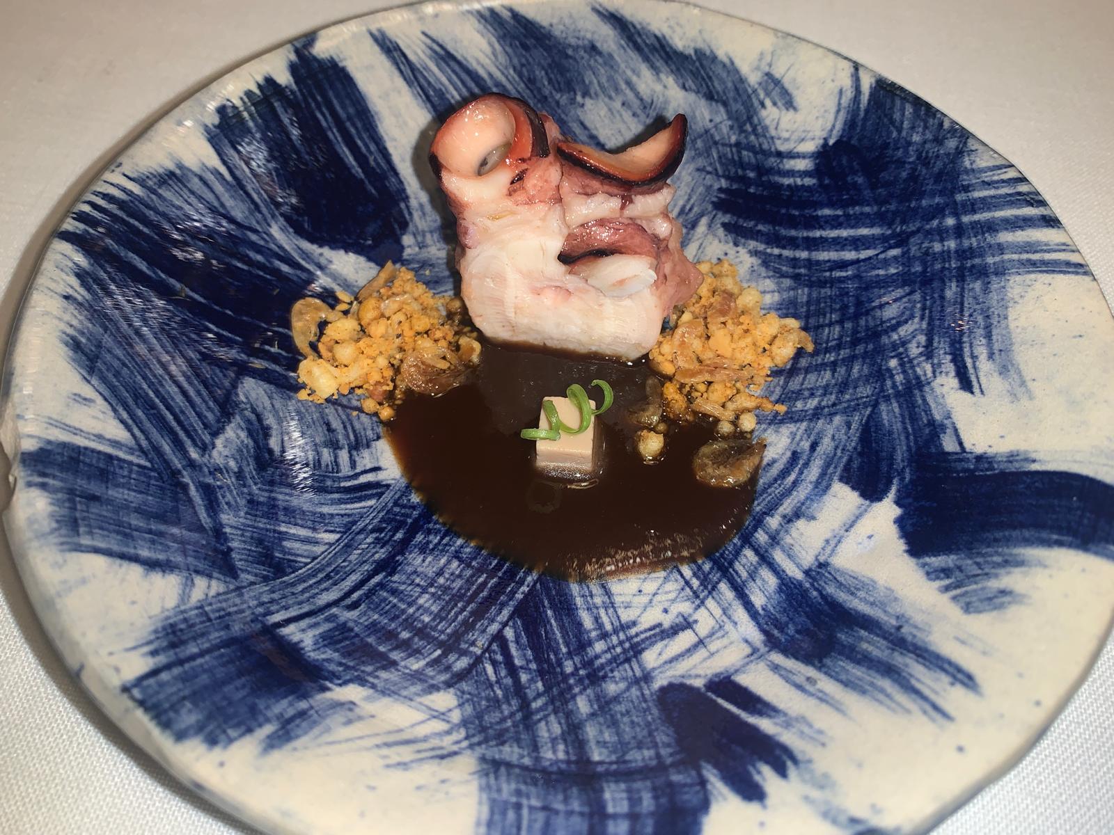 Aqui, vem na forma de um bolinho de feijão frade (com um aspeto e uma consistência que nos fizeram lembrar do pastel de bacalhau) com vatapá de carabineiro, deixando-nos a lamber os dedos. Depois, polvo grelhado servido com molho padthai e amendoim.