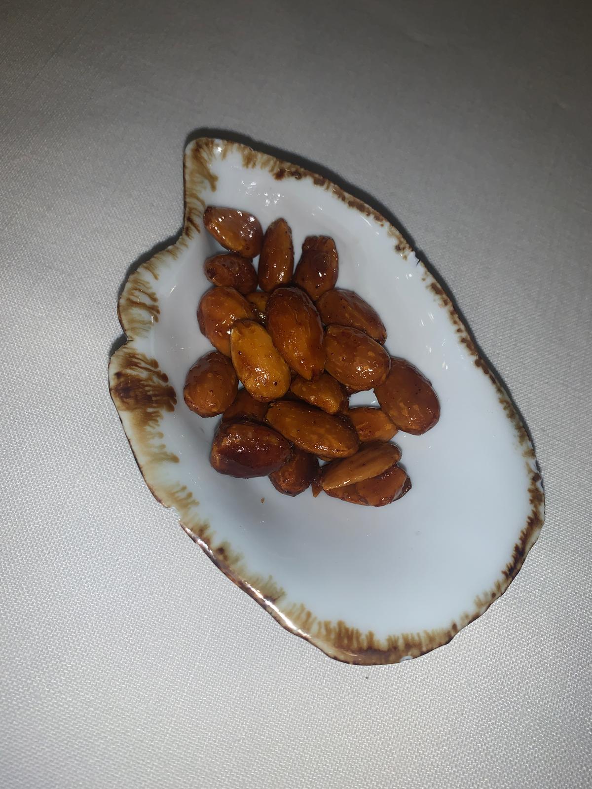 Numa noite de lua cheia, sentámo-nos de frente para o mar, para o Géiser Marítimo de Paço de Arcos e para a Marginal enquanto embarcámos na viagem proposta pelo cozinheiro natural de Cascais, que nos ofereceu umas amêndoas caramelizadas com caril e flor de sal para nos entretermos, num momento inicial.