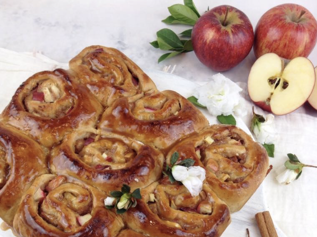 Numa superfície polvilhada com farinha, estique a bola de massa até obter um grande retângulo, usando o rolo de massa. Espalhe por toda a superfície o creme de maçã e tâmaras, polvilhe com canela e espalhe os pedaços de maçã, enrolando depois no sentido do comprimento e cortando em dez partes iguais. Em seguida, coloque os rolos no tabuleiro, tape com um pano e coloque num local quente entre 30 minutos a 1 hora. Pré-aqueça o forno a 180°C e, depois, deixe os rolos cozinhar durante 20 minutos. Finalmente, pincele os mesmos com o caramelo.