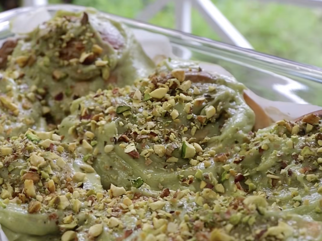 Abra a massa, pincele com a manteiga derretida, passe o recheio e polvilhe o açúcar com canela. Depois, enrole e corte em pedaços iguais. Coloque os rolos num tabuleiro untado e deixe algum espaço entre os mesmos. Deixe crescer por mais de 30 minutos. Em seguida, despeje um pouco de leite vegetal na travessa antes de os levar ao forno. Deixe assar entre 20 e 25 minutos, a 200°C. Prepare a cobertura, misturando todos os ingredientes até formar um creme homogéneo. Depois de os rolos estarem cozinhados, espere 15 minutos e adicione a cobertura aos mesmos e finalize com pistácio picado.
