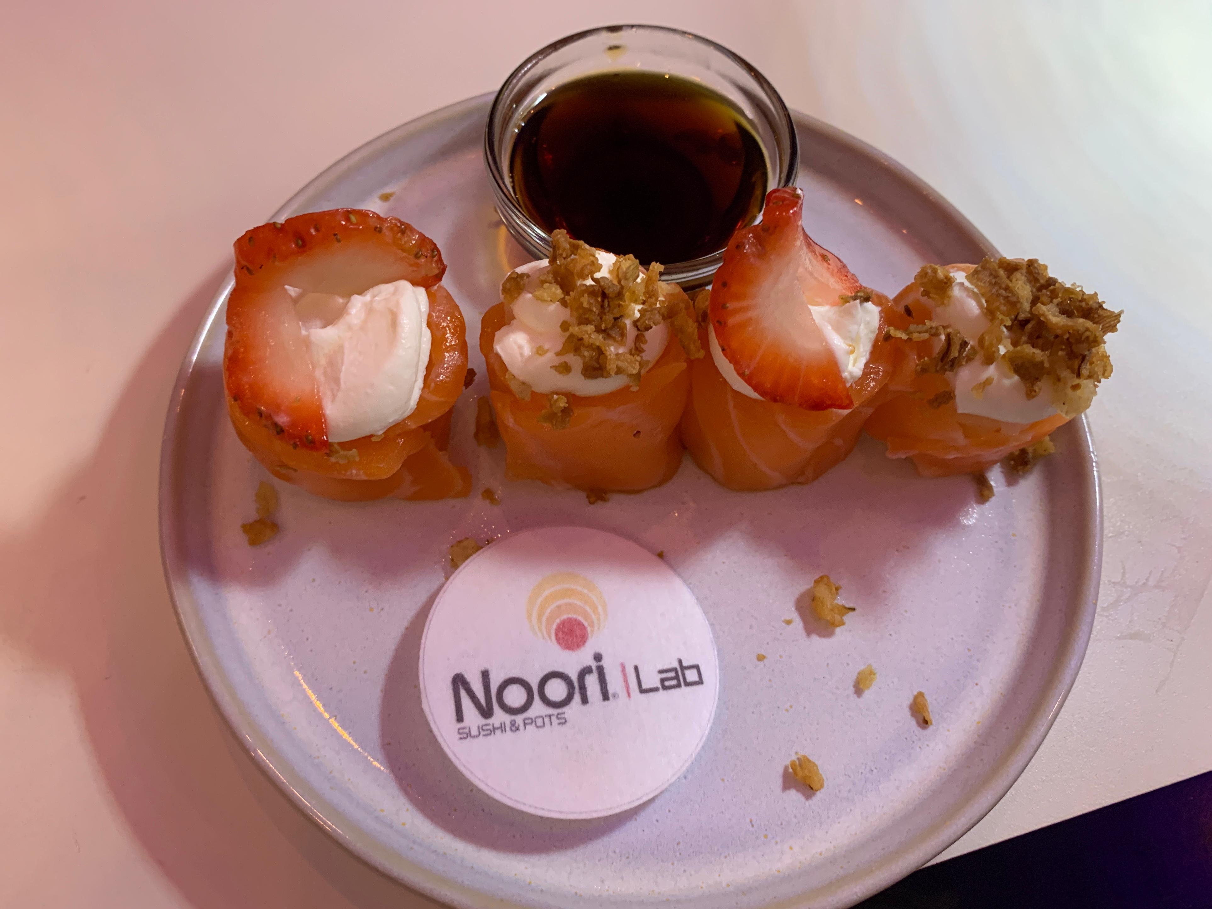 O Noori Lab foi a mais recente abertura e funciona como um espaço exploratório dedicado ao teste e à criação de novas receitas, oferecendo produtos exclusivos. Experimentámos quatro gunkans com queijo creme (dois com cebola frita e os outros dois com morango), uma proposta que custa 5,45€ e que foi das nossas favoritas.