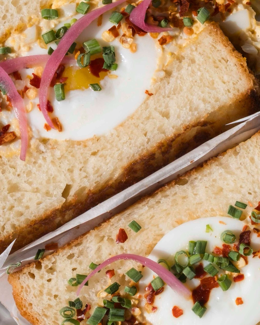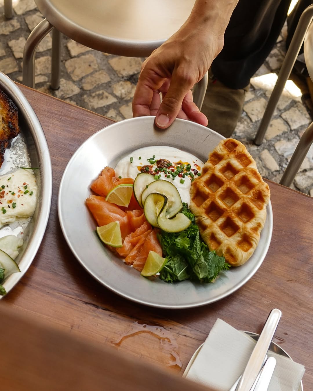 A ementa continua com propostas como croffle de salmão com salmão, labneh, pepino, chili oil e cebolinho (11€), iogurte com granola e compota caseiras, fruta da época, creme de pistácio e mel (7€) e ovos mexidos ou estrelados com ervilha torta, focaccia, pecorino, manteiga fouettée e sucrine com parmesão (11€)