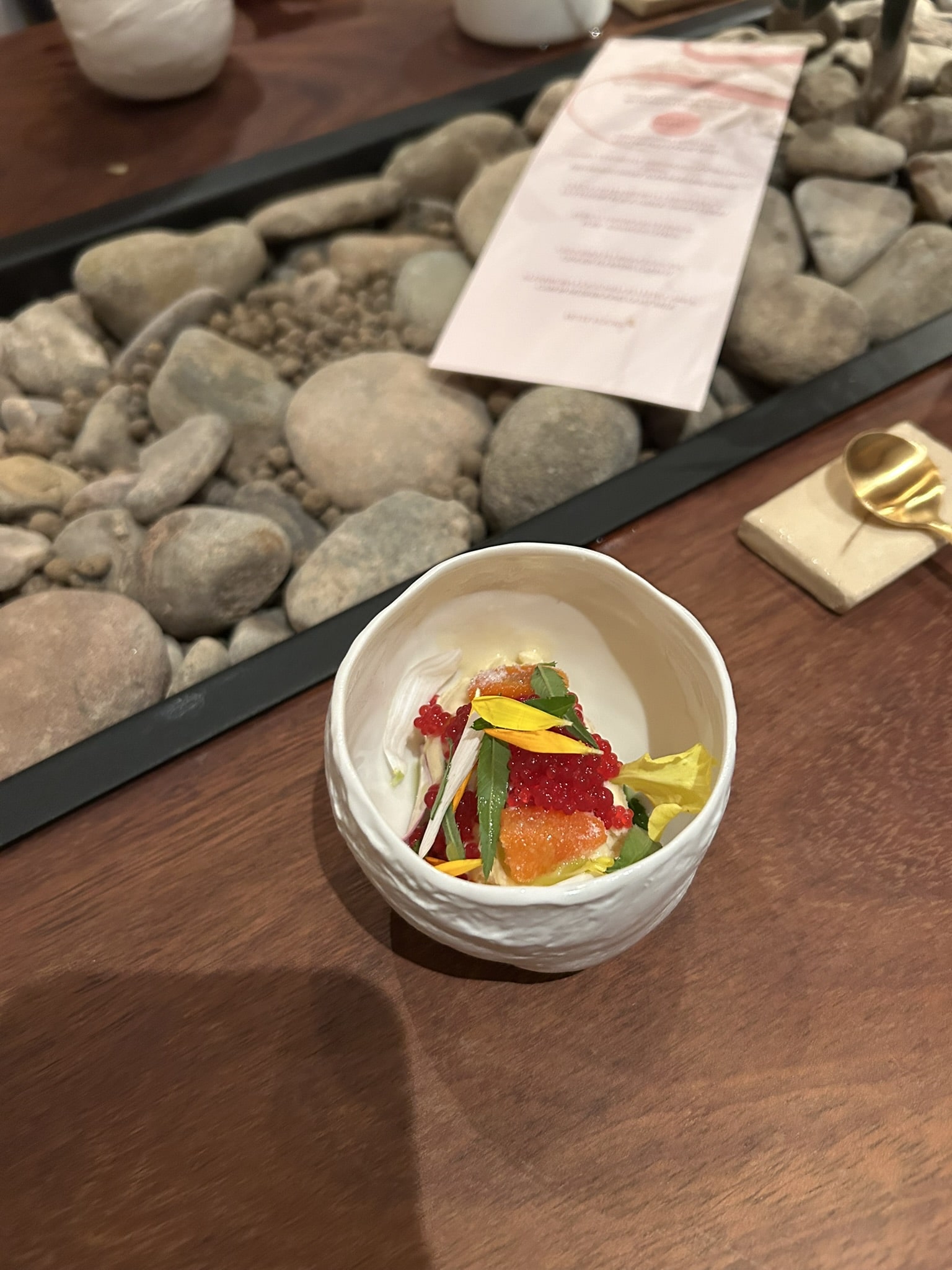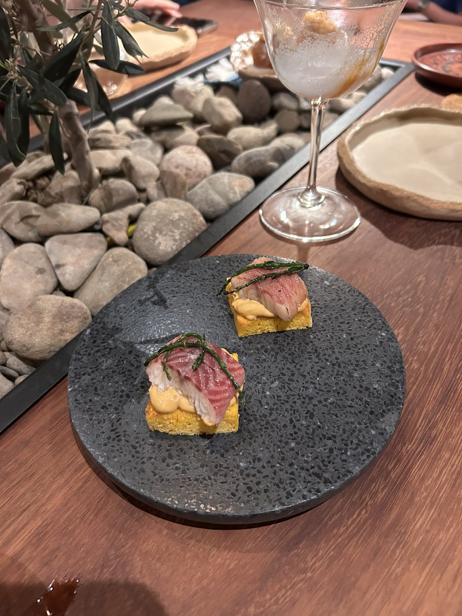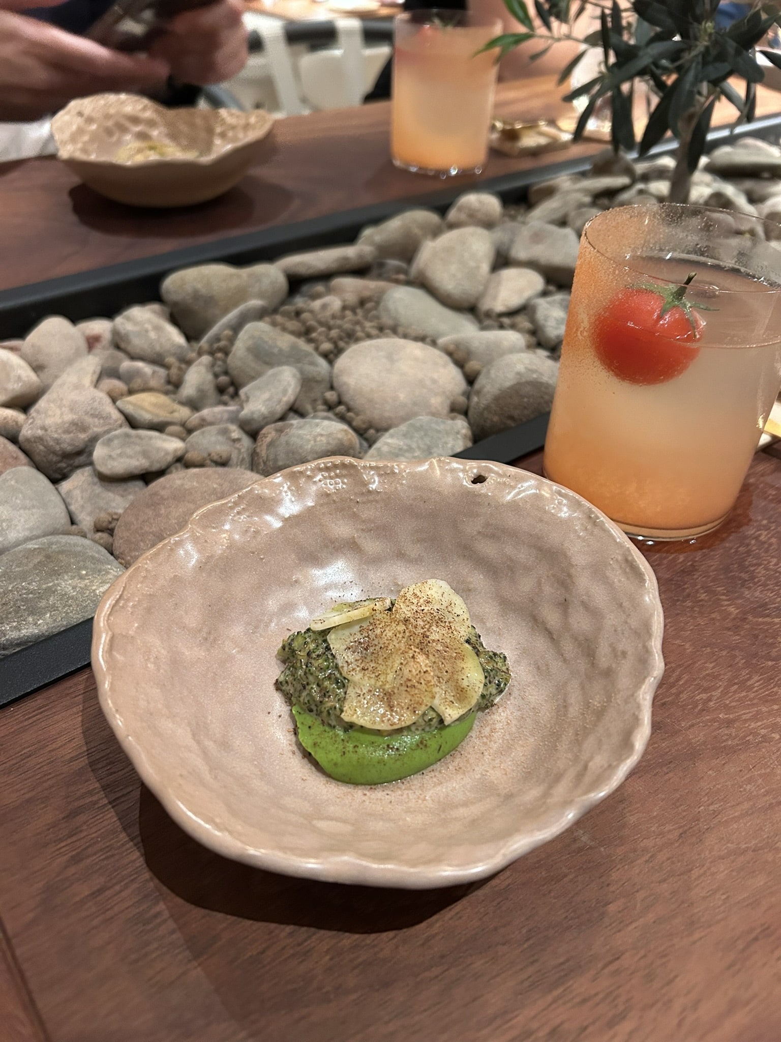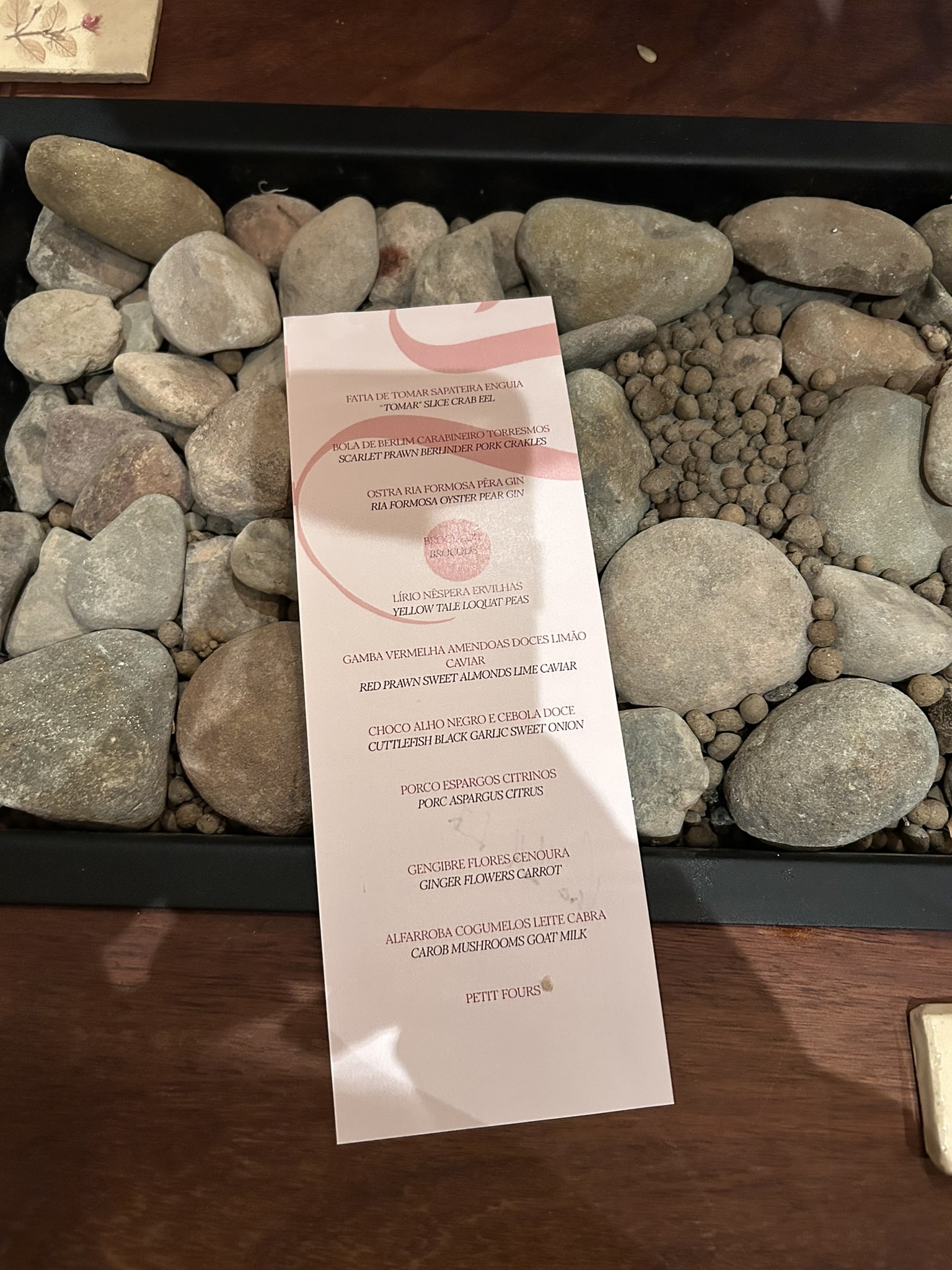 Em mesas altas e sofisticadas ou em mesas mais intimistas, o primeiro momento não faz parte do menu em si, uma vez que é apenas um cocktail de boas-vindas, mas a experiência começa logo assim que colocar o pé dentro do Solalua. Ao sentar, irá ter o menu diante de si, e é aí então que vai descobrir a viagem gastronómica que vai fazer ao longo da noite - neste primeiro jantar, podemos já dar o spoiler que foi extraordinária, com alguns pontos mais fortes do que outros, mas a experiência em si é, certamente, para repetir.