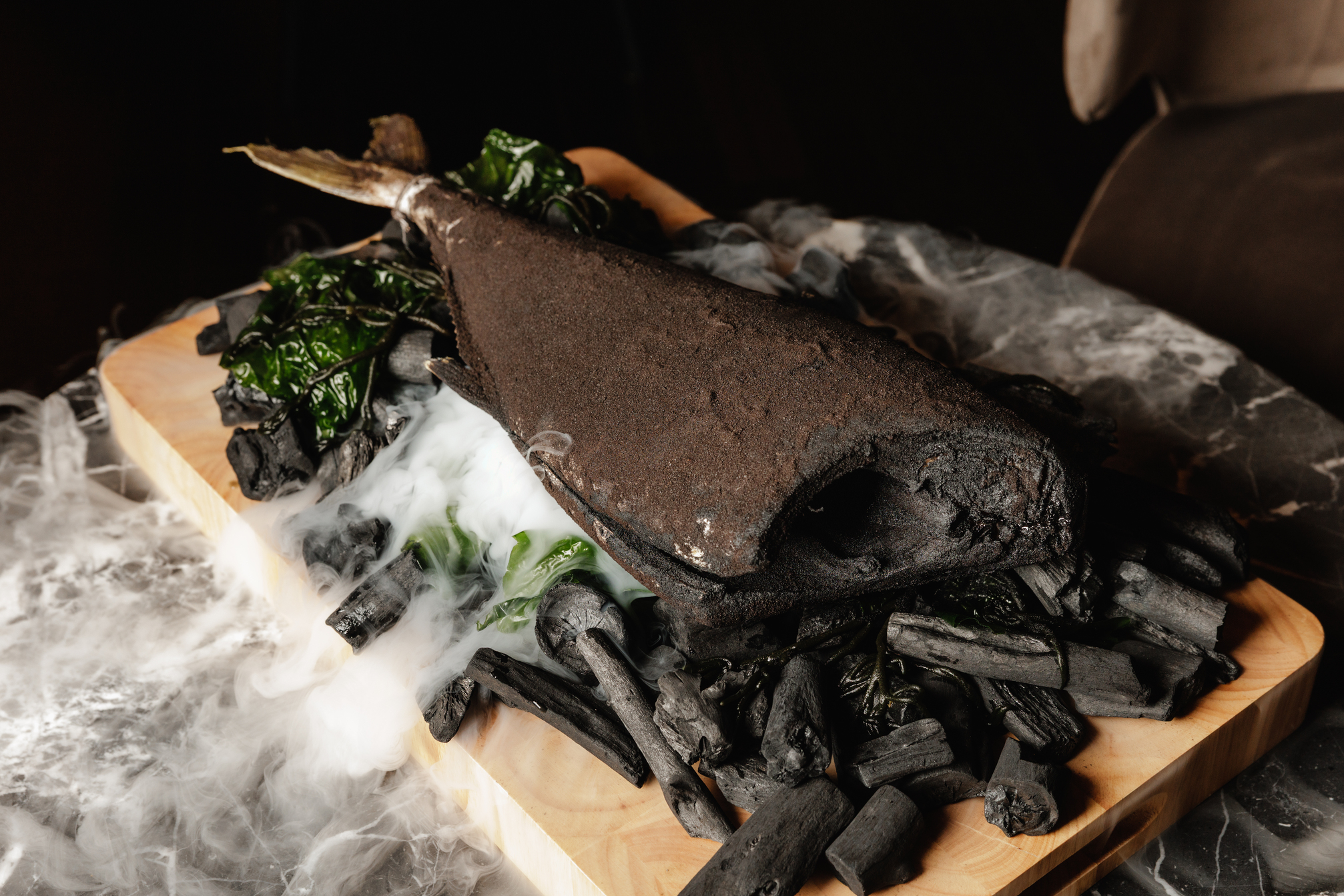 Nos pratos principais, destacam-se o salmonete com puré de cebola (35€), o pato maturado (32€) e o frango frito com molho coreano (30€). Para adoçar a boca há o gelado de pau santo (11€) e o pudim flan da avó do Chef com trufa (12€).