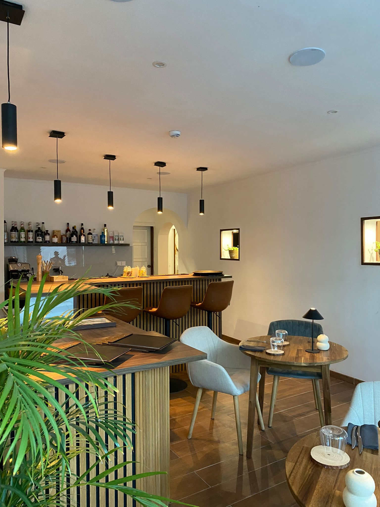 Privilegiando a técnica da gastronomia contemporânea, Pedro Larcher de Resende apresenta pratos como o pão de queijo da Ilha com manteiga fumada com alecrim (5€), o tataki de atum com dashi de maçã e abacate (14€) e a salada de figo com queijo de cabra e nozes (12€).