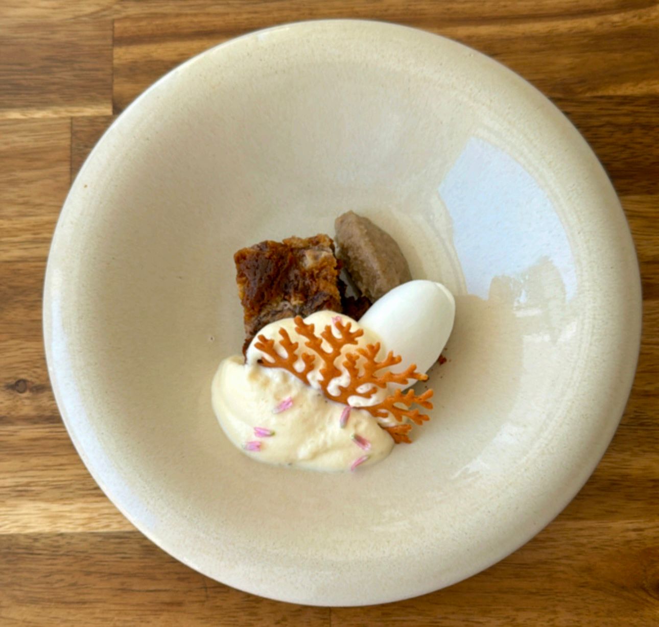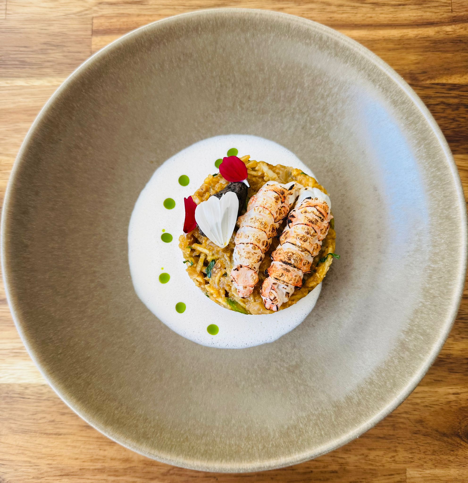 Para principais, o à Brás de lagostim, com creme de caju e óleo de manjericão (23€), o pernil de borrego assado com arroz de forno, laranja e hortelã (25€), o cachaço de porco, favada com chouriço, pickle de cebola e couratos (25€) e o peixe do dia com batata, algas e amendoim (24€).