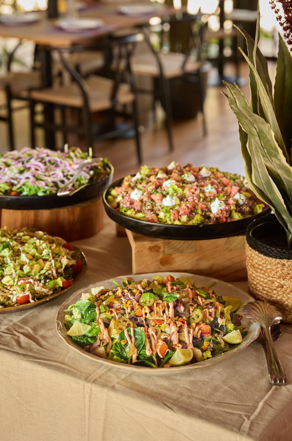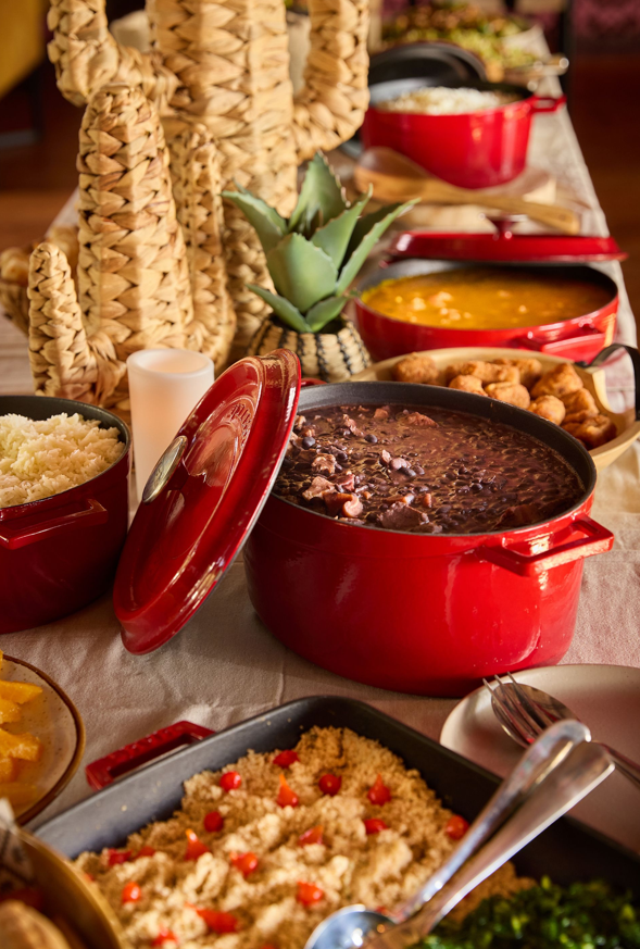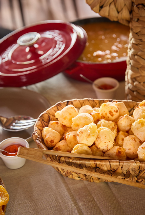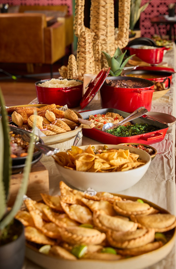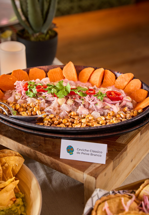 A proposta gastronómica é uma viagem pelos sabores latino-americanos, com opções frescas e reconfortantes. Entre saladas e ceviches, não faltam clássicos como pão de queijo, empanadas, calabresa acebolada, mandioca frita, picanha e bobó de camarão.