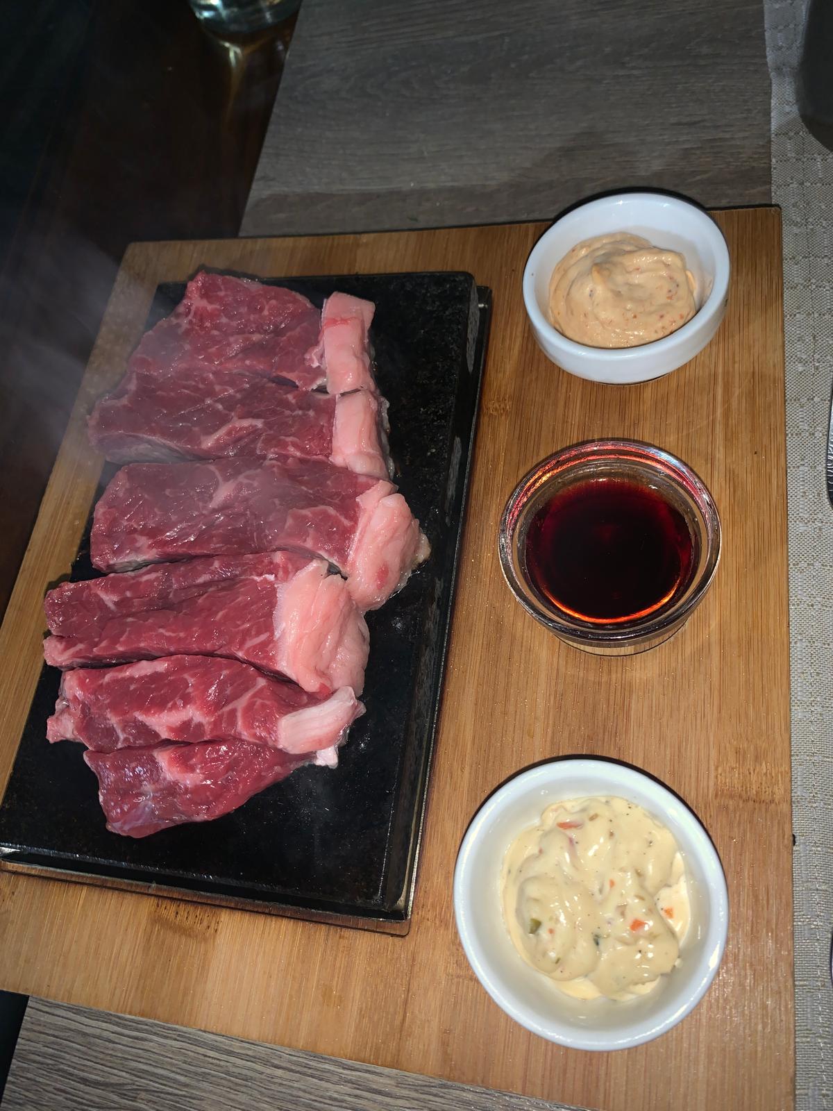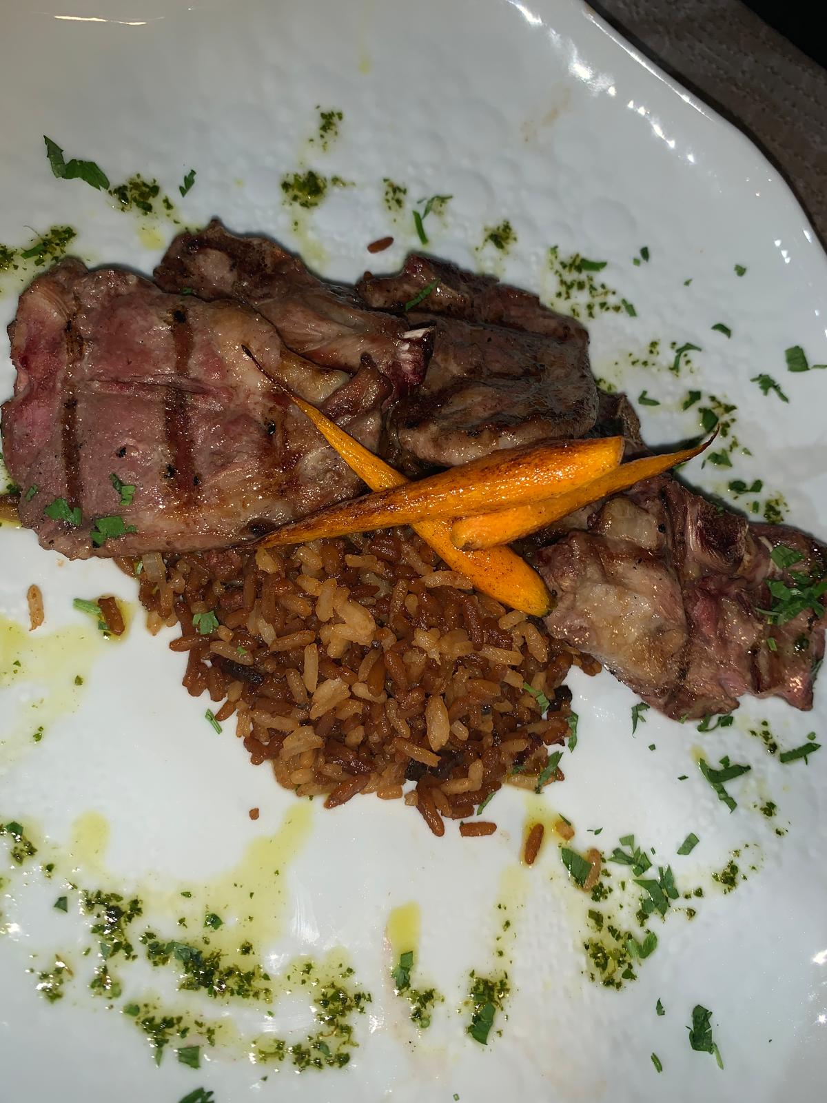Para principal, optámos pelo naco na pedra com três molhos, batata frita e salada de folhas verdes (40€), uma carne suculenta, numa dose generosa, ideal para quem tem mais fome, e pela costeleta de borrego grelhada com cenoura baby salteada e arroz de enchidos (32€), outra opção fantástica.