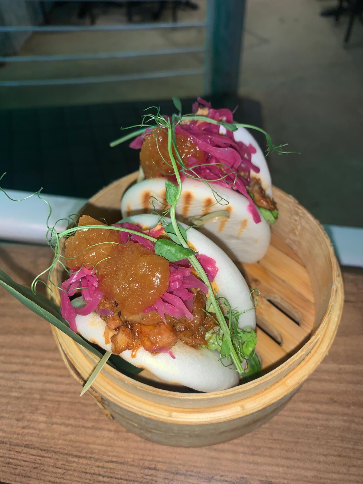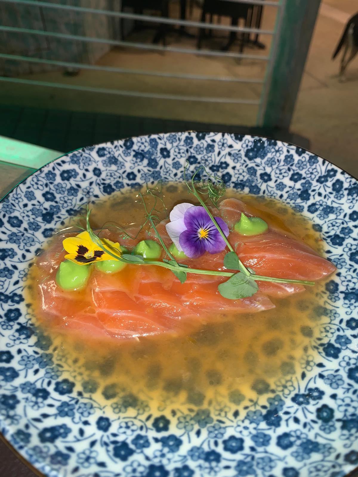 Não resistimos a provar o bao de porco Kalua ou frango Huli Huli com queijo feta, chutney de ananás e maionese de malagueta (12€/2un) — e ainda bem, porque estava incrível. Também gostámos do tiradito de salmão com salsa queimada, soja de maracujá e lima (13€), uma espécie de sashimi marinado.