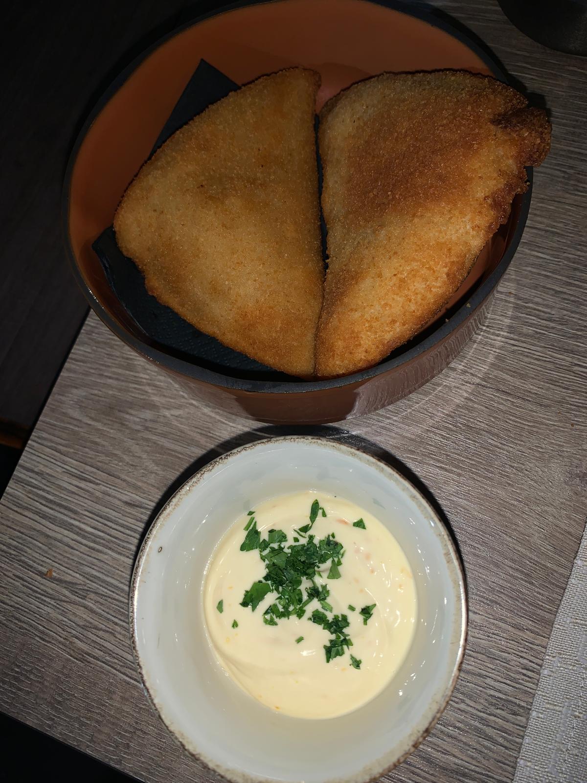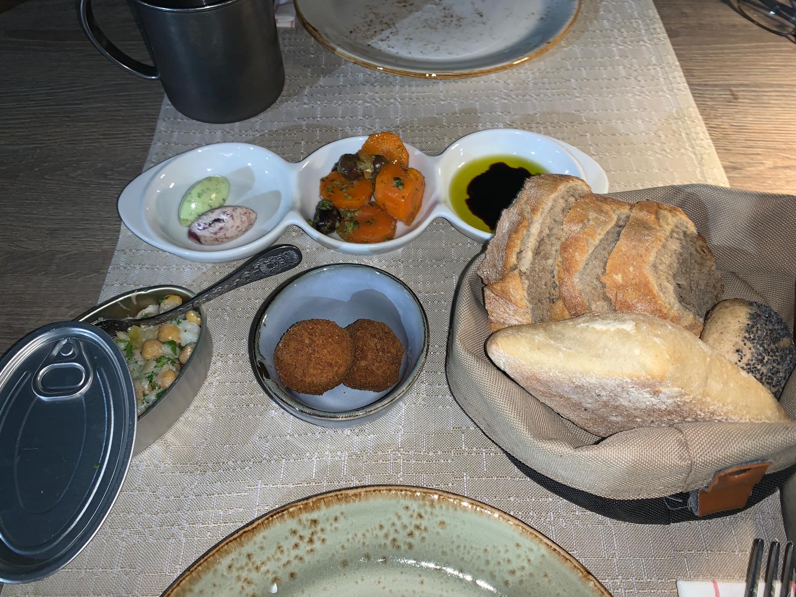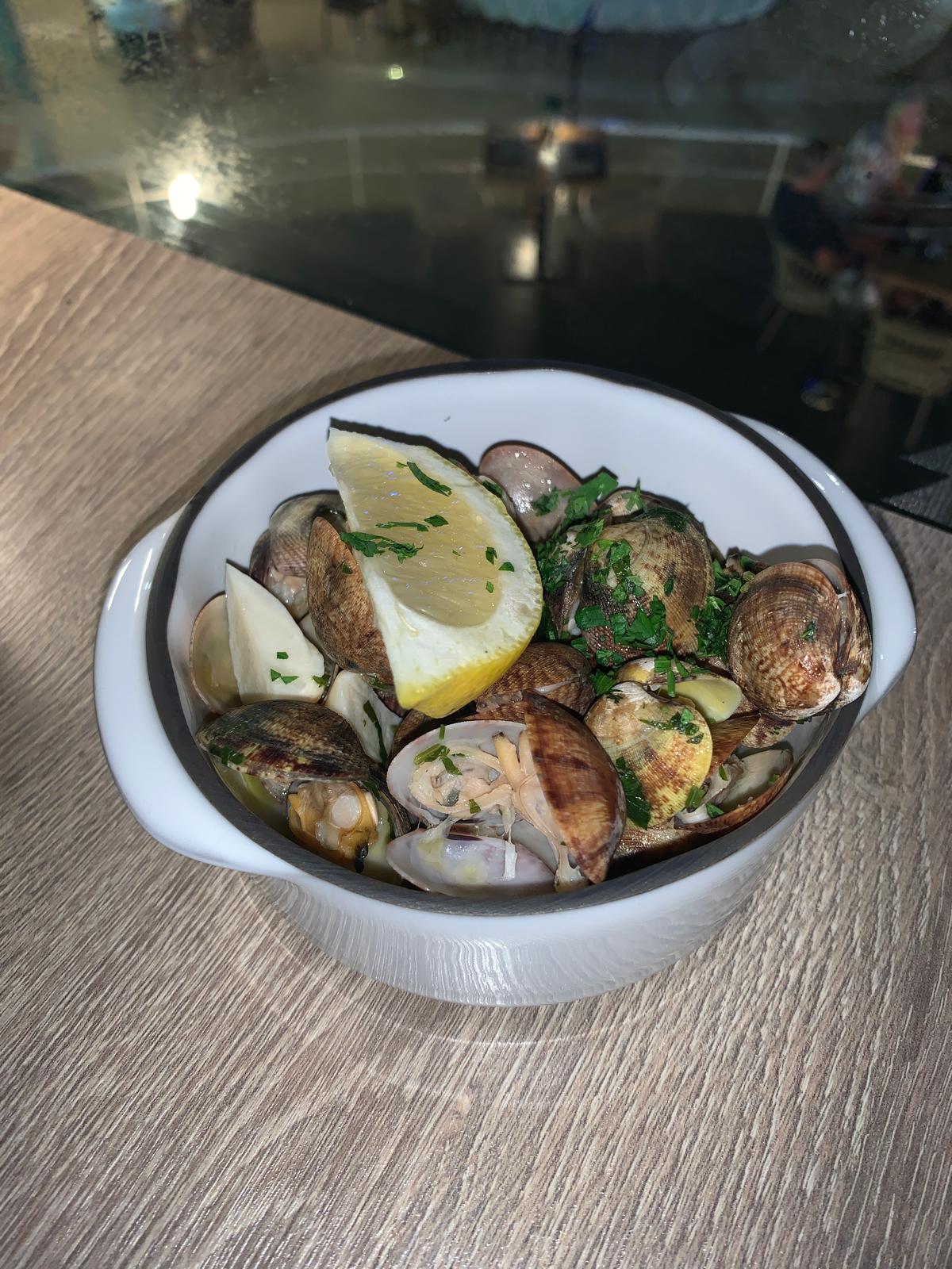 O nosso jantar começou com o couvert do chef, com pão, manteiga, cenoura, salgado e conserva (11€). Seguimos para o rissol de leitão da Bairrada com maionese de laranja (9,50€), que é crocante, nada seco e mesmo bom. Impressionou-nos mais do que as amêijoas à Bulhão Pato (30€).