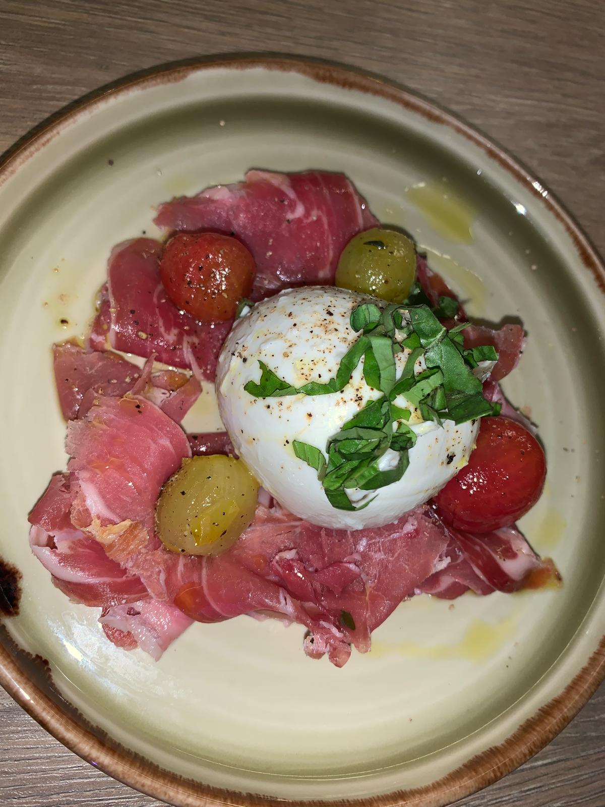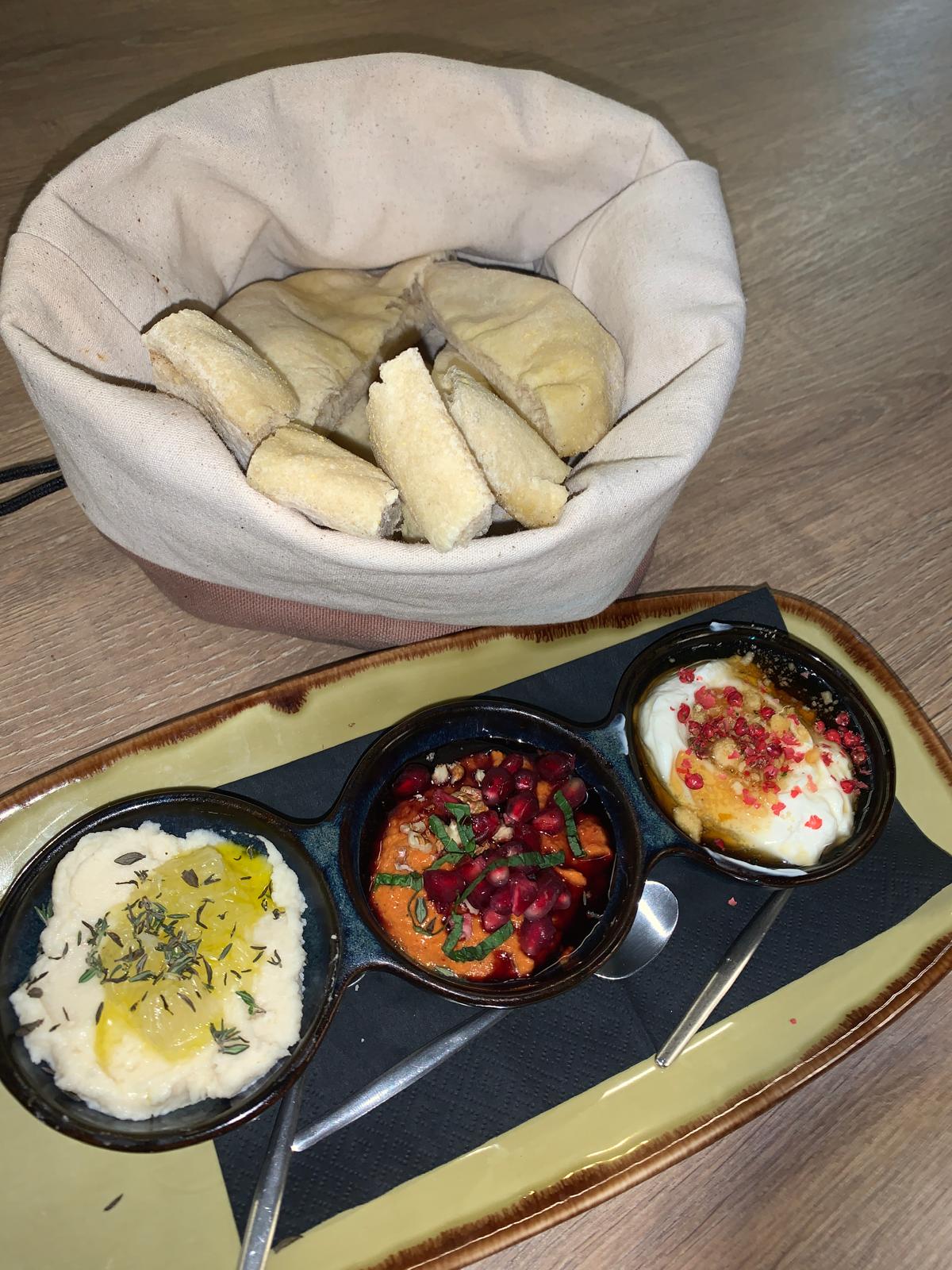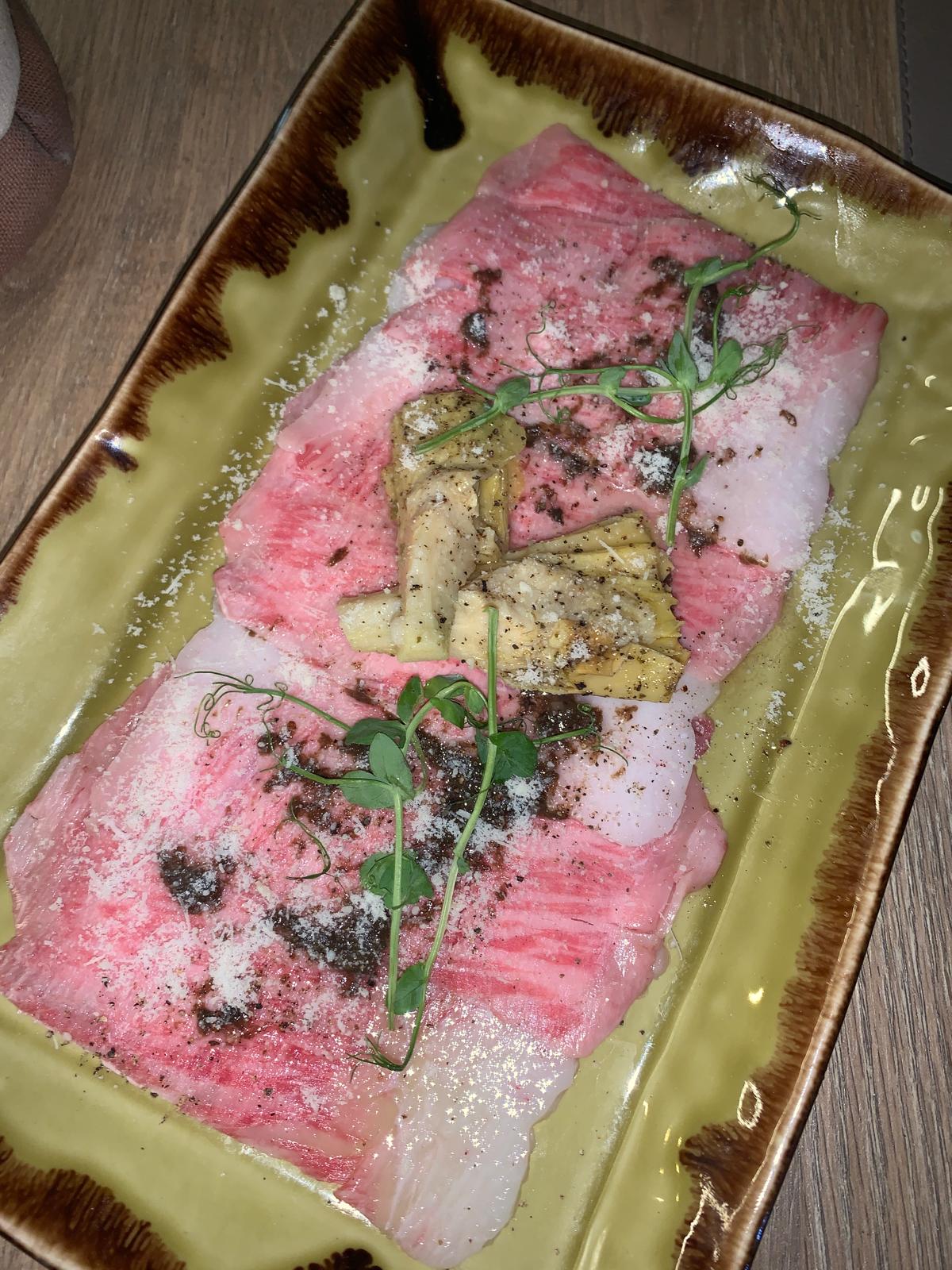 Começámos pela trilogia, com húmus de fava, ricota emulsionada, puré de pimento assado e pinsa branca (15€) e passámos para o carpaccio de wagyu com alcachofras, parmesão e trufa preta (24€), que, ao contrário dos outros pratos, foi espetacular, do melhor que já comemos.