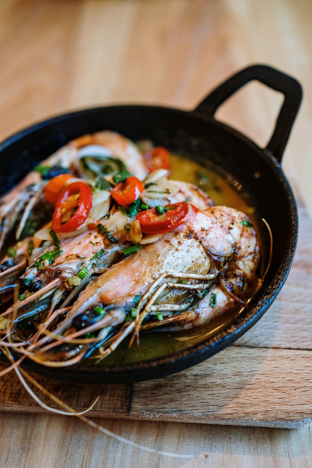 A carta apresenta uma seleção de petiscos e pratos tradicionais, pensados para partilhar. Entre as sugestões, destacam-se os camarões salteados (16€), o salteado de novilho à portuguesa (14€), os croquetes de novilho (8€), as asinhas de frango picantes (8€), os pastéis de bacalhau (8€) e o pica-pau de legumes (8€).