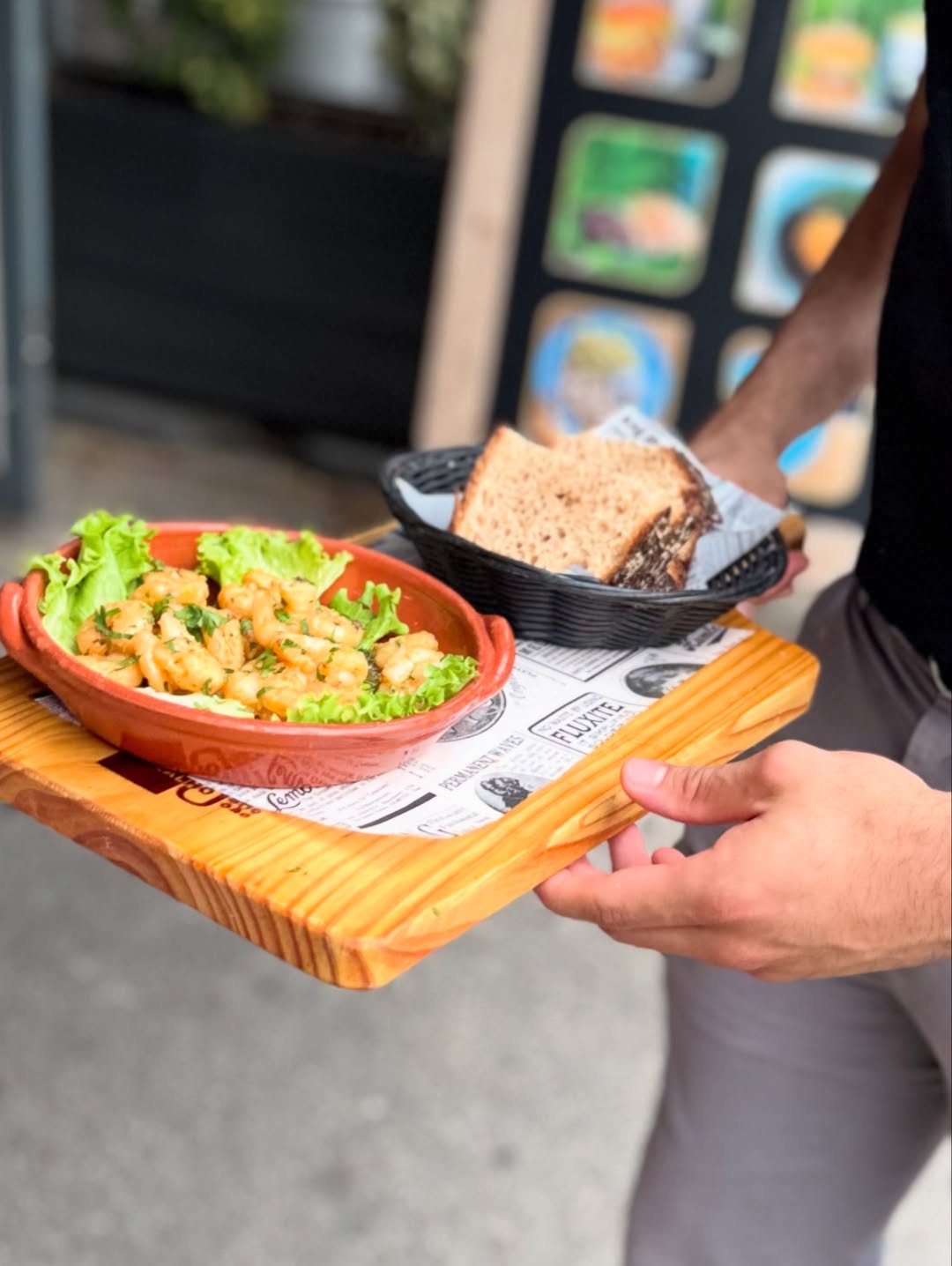 Também há strogonoff de camarão com arroz e batata frita (15,90€), carne seca acebolada com arroz, mandioca frita e feijão preto (14,90€) ou espetinho de frango e bacon (4,20€), de camarão (4,90€), de coração de galinha (4,50€) ou de calarbesa (4,50€).