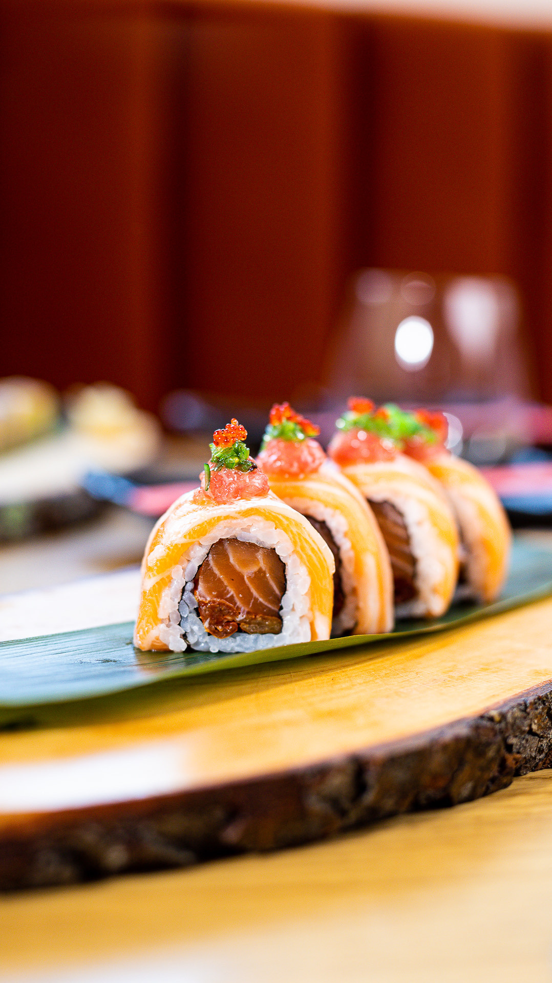 À carta, também pode pedir um combinado de gunkan fusão (22€/10un), uramakis como o maki Edo especial, com salmão, camarão e queijo creme envolvido em salmão braseado (7€/4un) ou um trio de tês mini temakis de salmão, salmão especial e skin (10€).