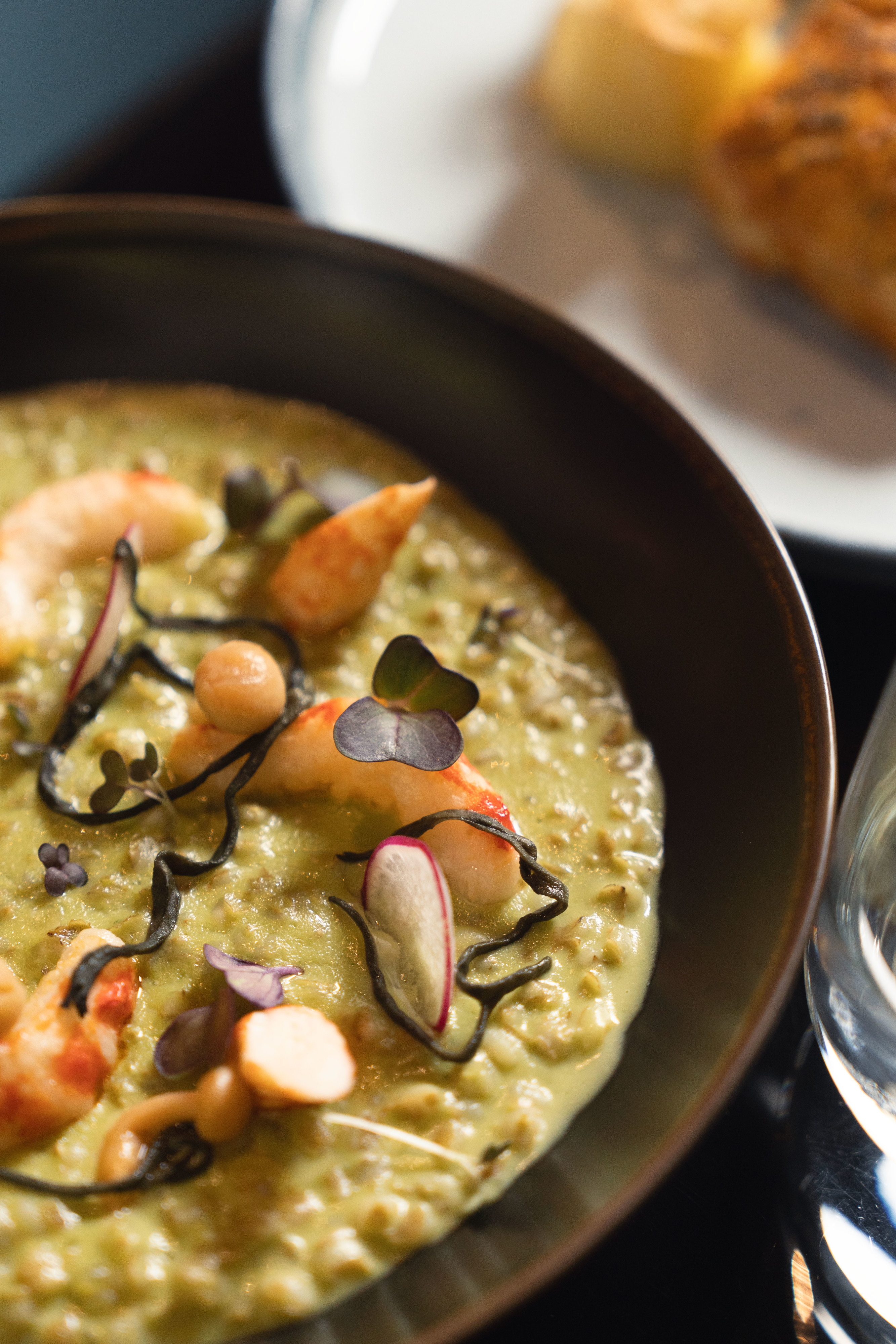 As entradas passam por opções como o requeijão fresco com hortelã e confitado de abóbora (12€) e a beringela em emulsão de nozes (10€). Há sopas, croquetes georgianos (10€), saladas e os bolinhos georgianos khinkali, uma espécie de dumplings (10€/8un), que existem nas versões de cogumelo, de queijo, de vaca DOP e tradicional.